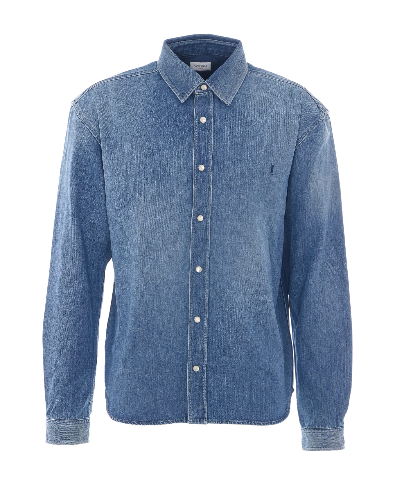 Saint Laurent blue Cassandre denim shirt, crewneck, snap buttons closure, monogram embroidered logo on front, classic collar Composition: 100% Cotton