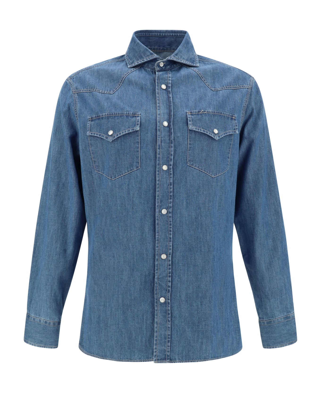 Cotton denim shirt by brunello cucinelli, featuring a classic collar, a front button closure, two front patch pockets with a flap for closure, adjustable button cuffs, and a regular fit.