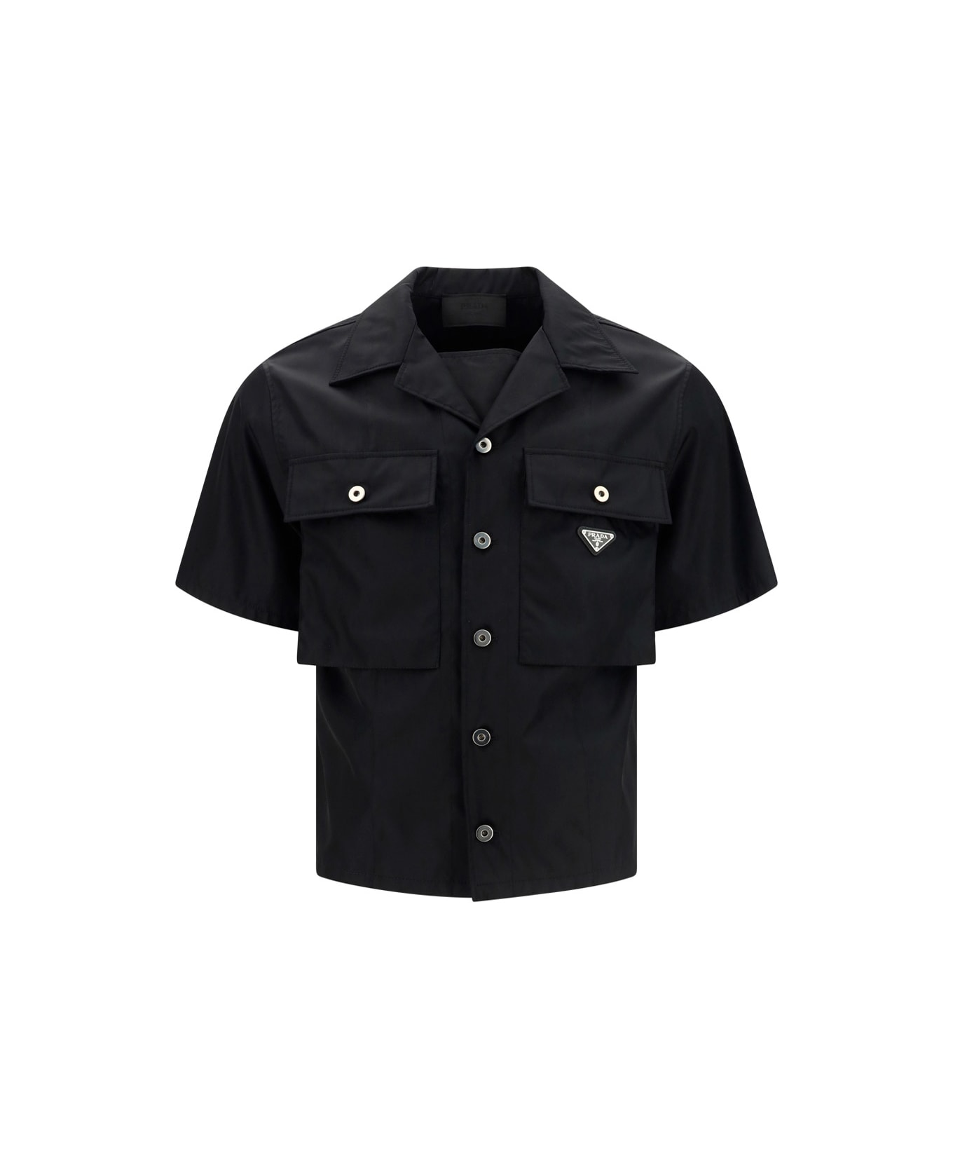 Shirt by prada, design in iconic re-nylon material, short-sleeved design, classic collar, front button closure, two patch pockets on front with flap for closure, iconic triangular enameled brand signature plaque applied in contrast on front, regular fit. Composition: 100% % Polyamide
