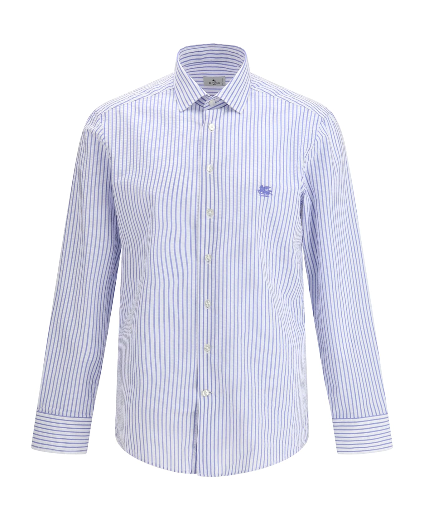 The striped cotton shirt by etro is crafted from a refined textured fabric and detailed with an embroidered pegaso logo on the left chest. featuring a classic collar, button fastening, and rounded button cuffs, it is finished with a curved hem, embodying the brand s signature sophistication.