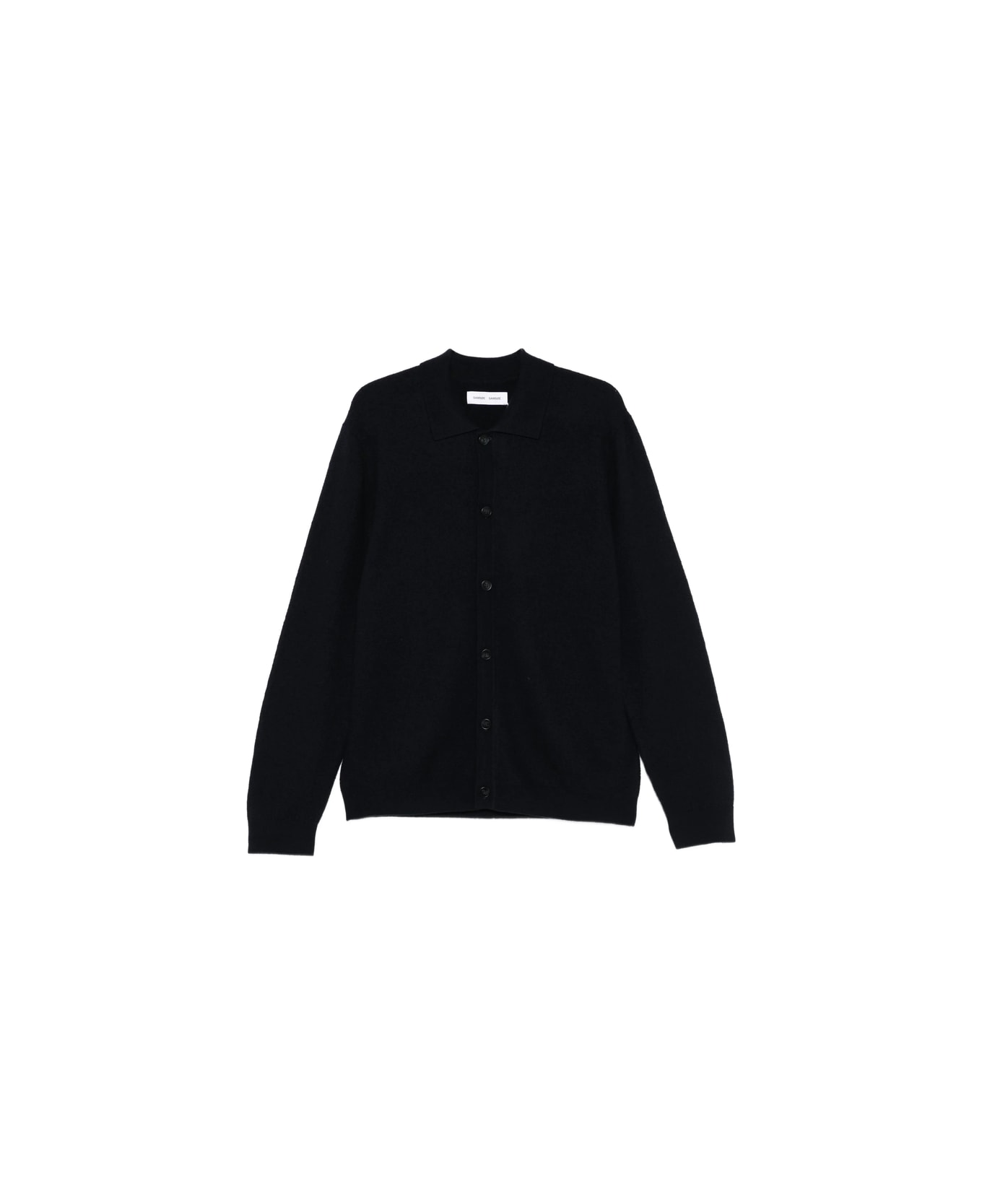 black collar neck button fastening long sleeves ribbed cuffs straight hem