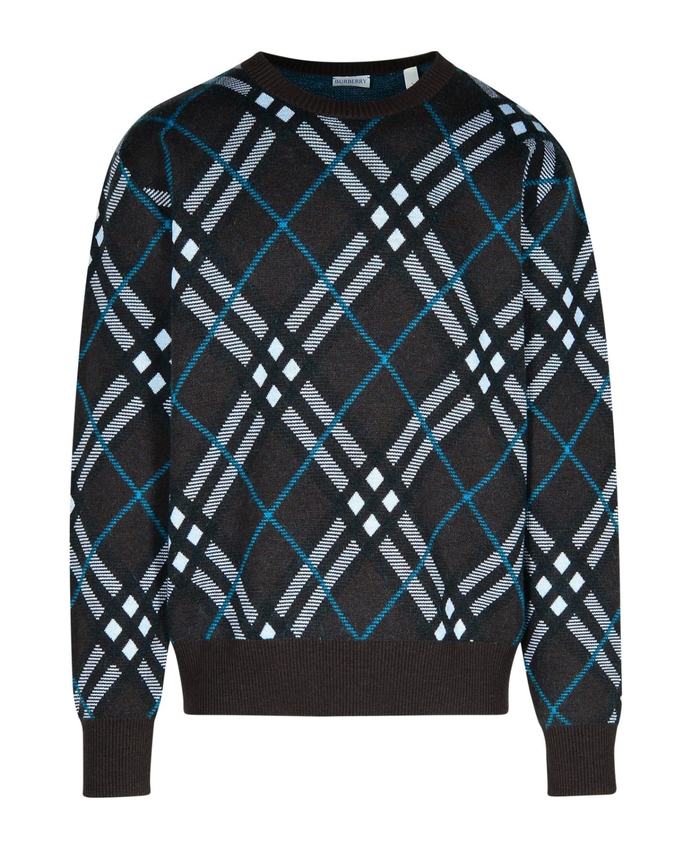 Ribbed crew neck, contrast check pattern, ribbed hem and cuffs, central split at the hem Composition: 86% wool, 7% mohair, 6% nylon, 1% elastane