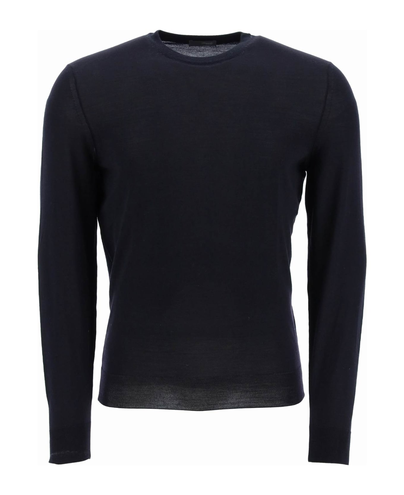 Crew-neck Drumohr sweater made of extrafine merino wool lightweight knit, featuring a slim fit and micro-ribbed edges. The model is 187 cm tall and wears a size IT 48.