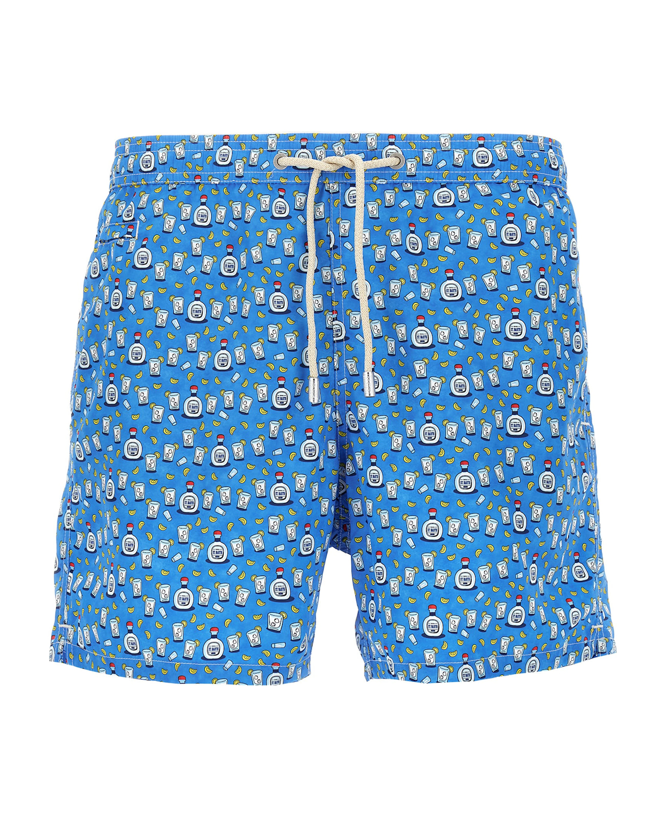 Lighting fabric swimsuit with all-over 'Watercolor Tequila' print, adjustable drawstring elastic waistband, back logo patch, pockets, inner mesh briefs. SUSTAINABLE: Product made from recycled polyester. Composition: 100% recycled polyester