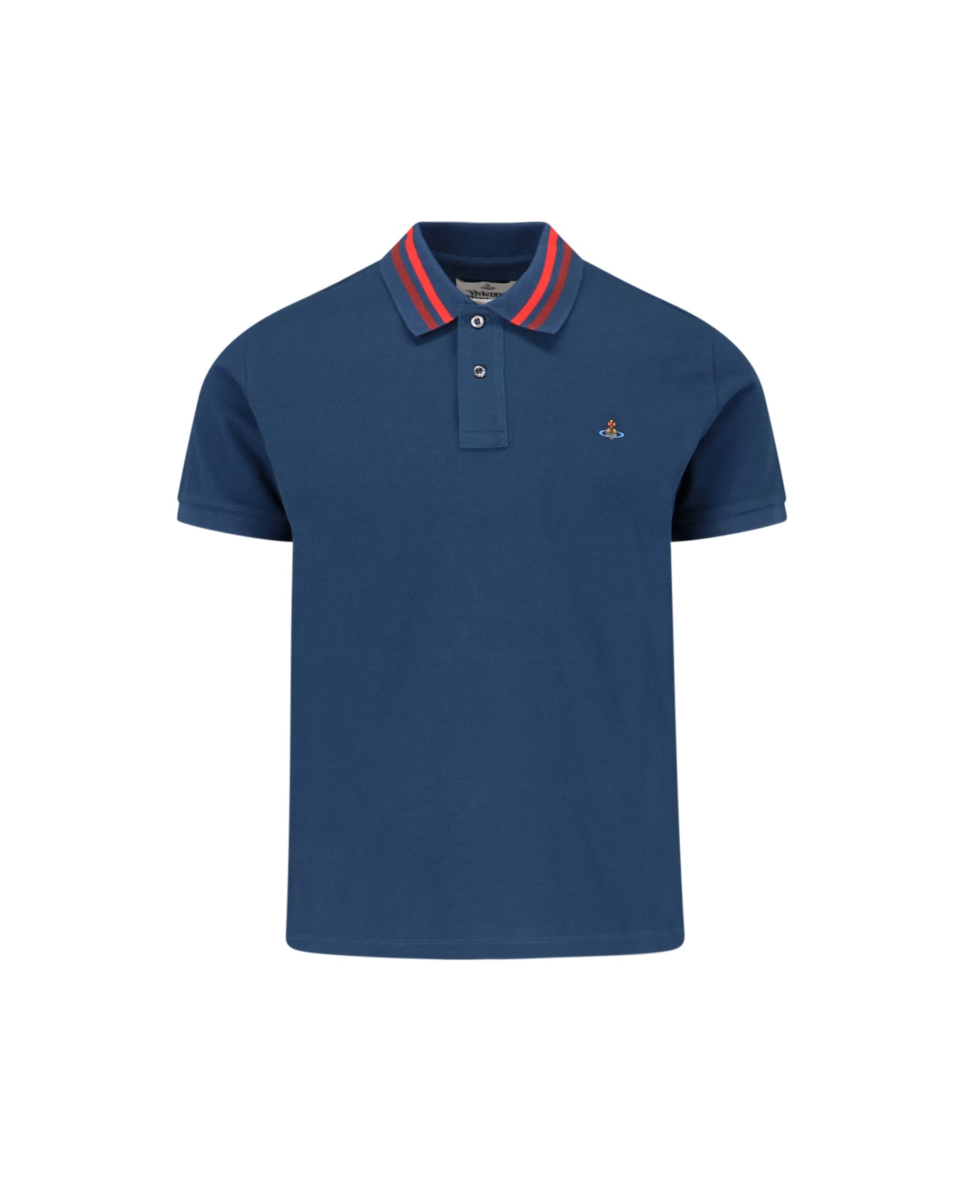 Vivienne Westwood 'Orb' logo polo shirt in navy blue cotton with classic collar, red stripe pattern detail, button closure, multicolor logo embroidery on the chest, ribbed trims, straight hem. Composition: 100% Cotton