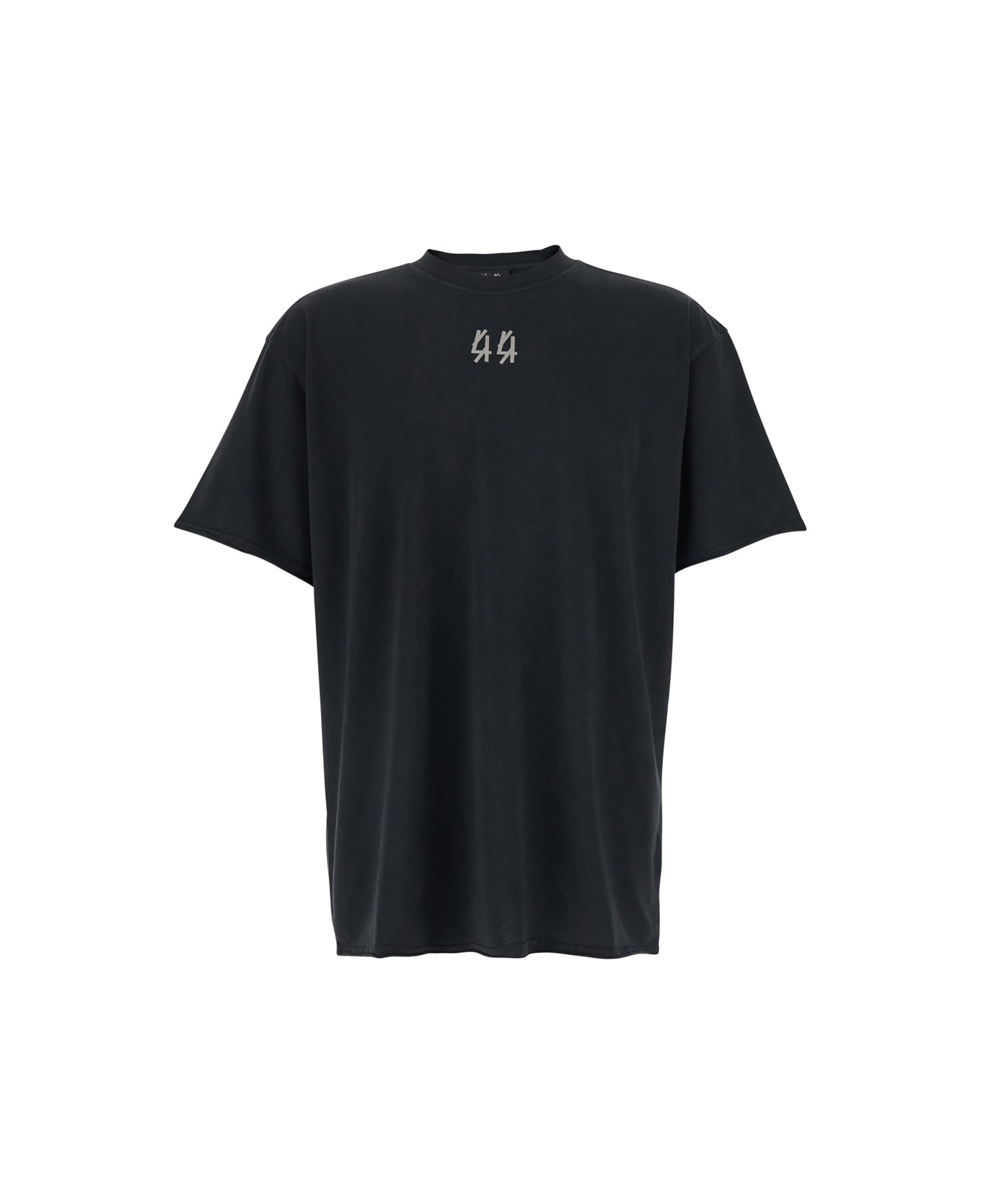 Black T-Shirt with Round Neck and Front Logo. Short sleeves and Dropped shoulders. straight hem. In Cotton. Oversized fit.