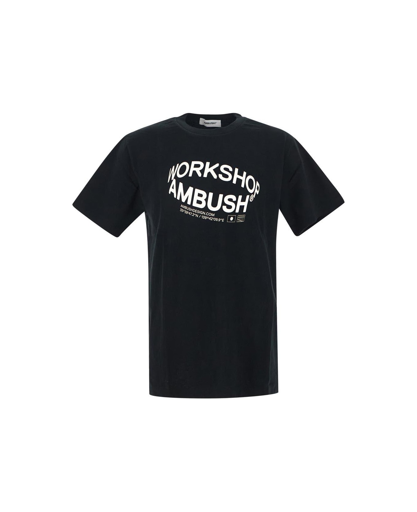 Ambush t-shirt in black cotton with short sleeves. The item is featured by crewneck, front white logo print and ribbed trim.