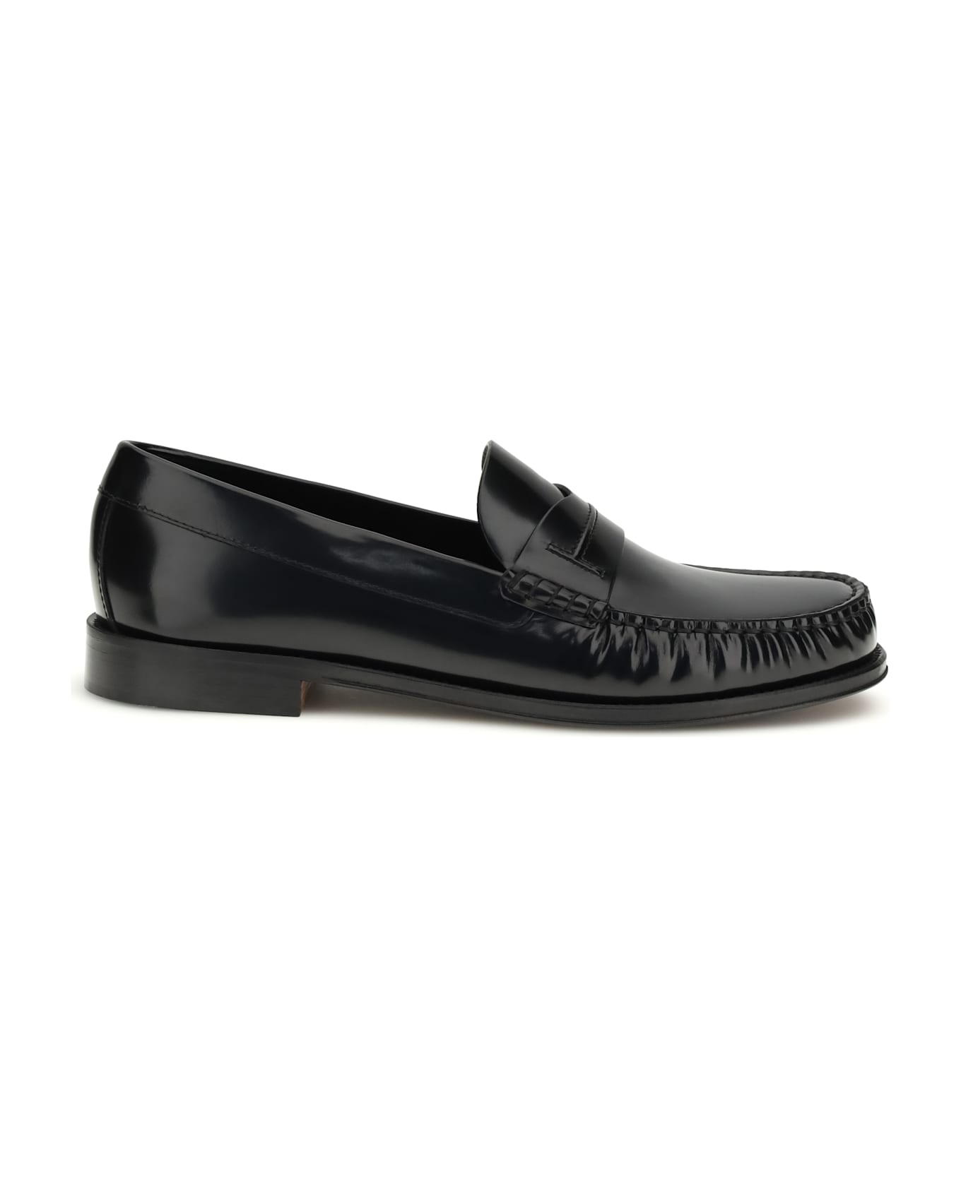 The polished leather loafers by tom ford combine elegance and comfort. the round toe and raised topstitching define the classic design, while the flat sole and engraved logo midsole add a distinctive and sophisticated touch, making them perfect for a sleek, contemporary look.