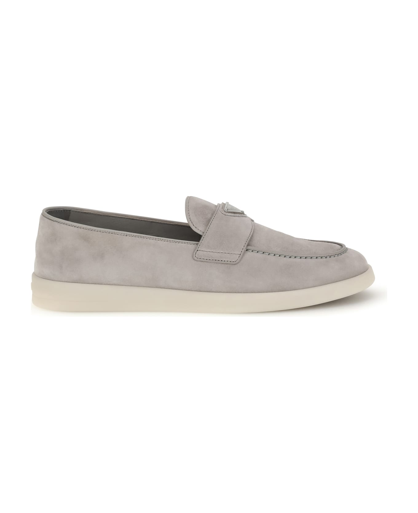 The leather loafers by prada feature an almond toe and a suede design that lends a touch of sophisticated elegance. the contrasting flat sole and front tray embellished with the brand's iconic triangular plaque add a distinctive detail. the logo-embossed insole completes the look, making these loafers a refined and versatile accessory. Composition: 100% % Calf Leather Bos Taurus, 100% % Rubber