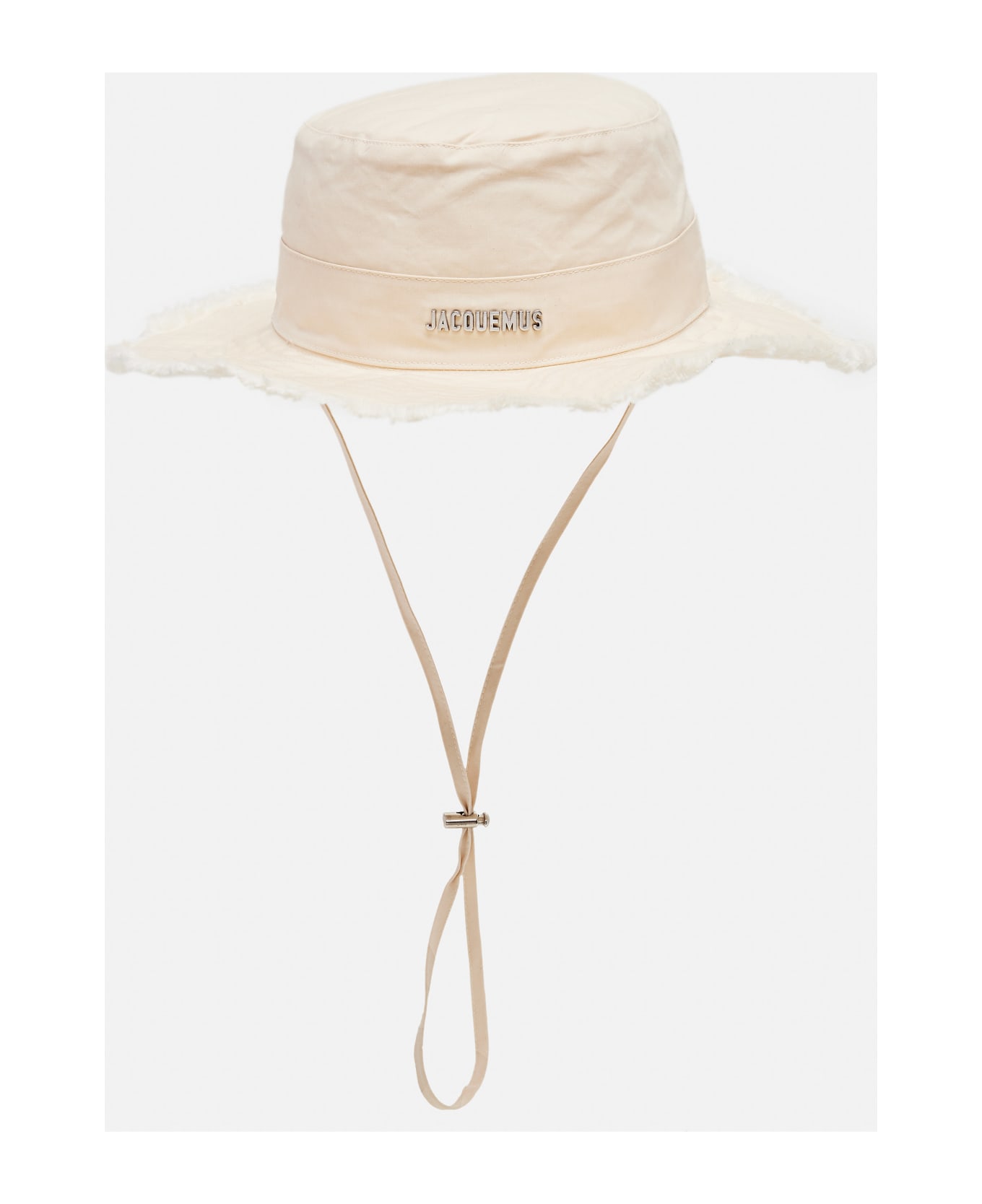 Adjustable chin strap. Front metal logo detail. Fringed hem. Color: white. Composition: 80% Polyester, 20% Cotton
