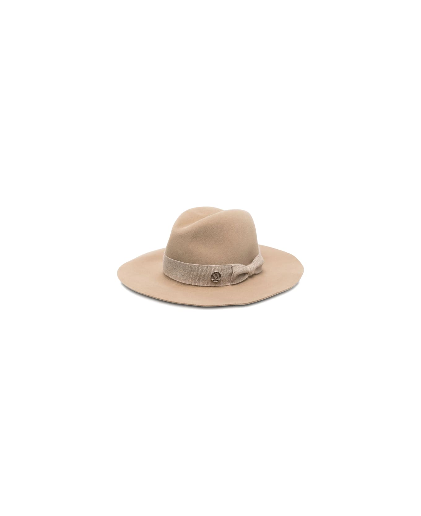 beige felt material ribbon band metallic logo emblem bow detail wide brim