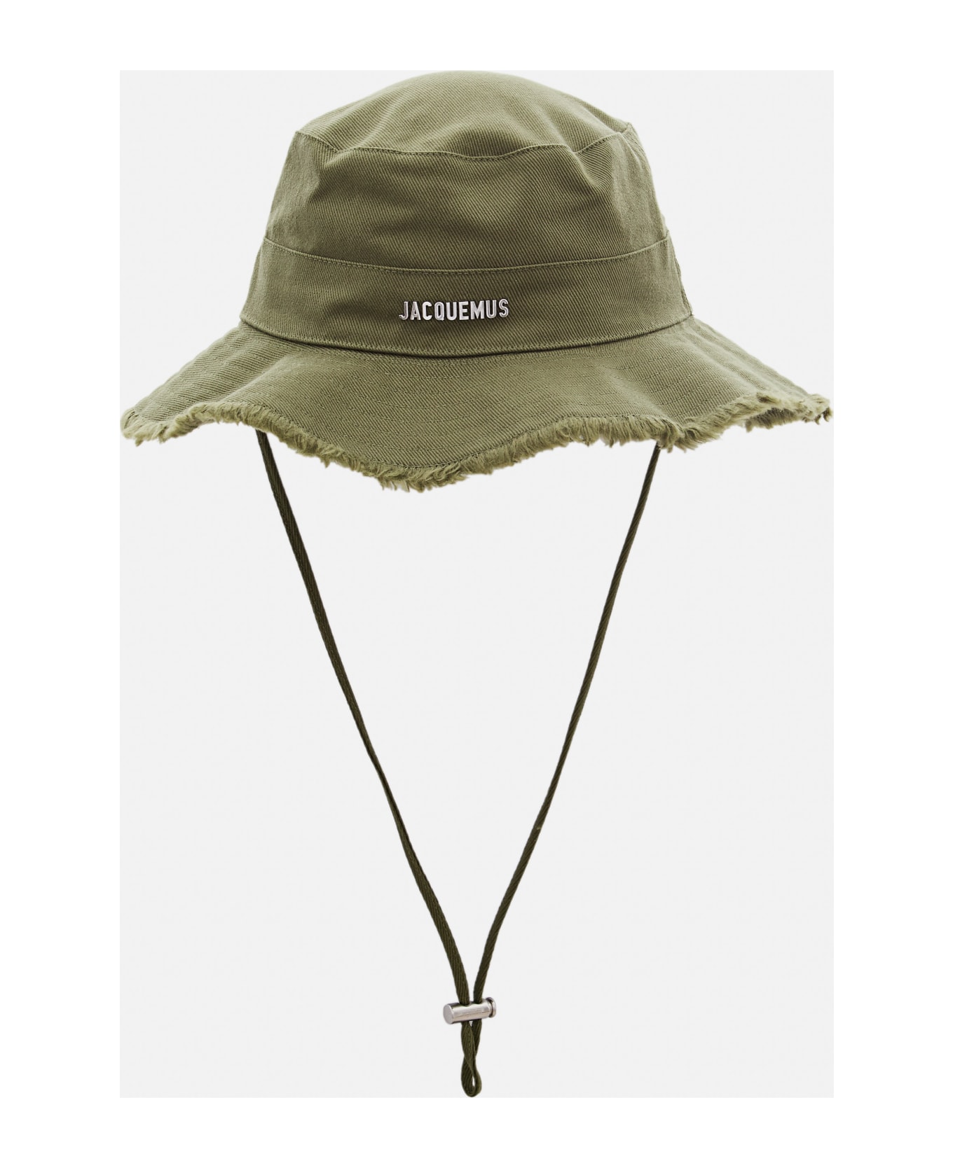 Large brim bucket hat. Adjustable chin drawstring. Raw edges. Silver JACQUEMUS logo. Color: green. Composition: 100% Cotton