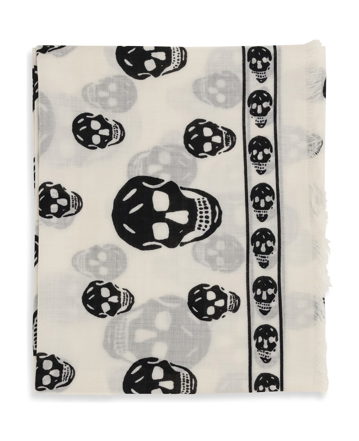 The skull foulard by mcqueen is crafted from a silk and modal blend in black and dark grey, featuring an all-over skull motif. the fringed edges are accented with skull details and the mcqueen logo, creating a distinctive, contemporary accessory.