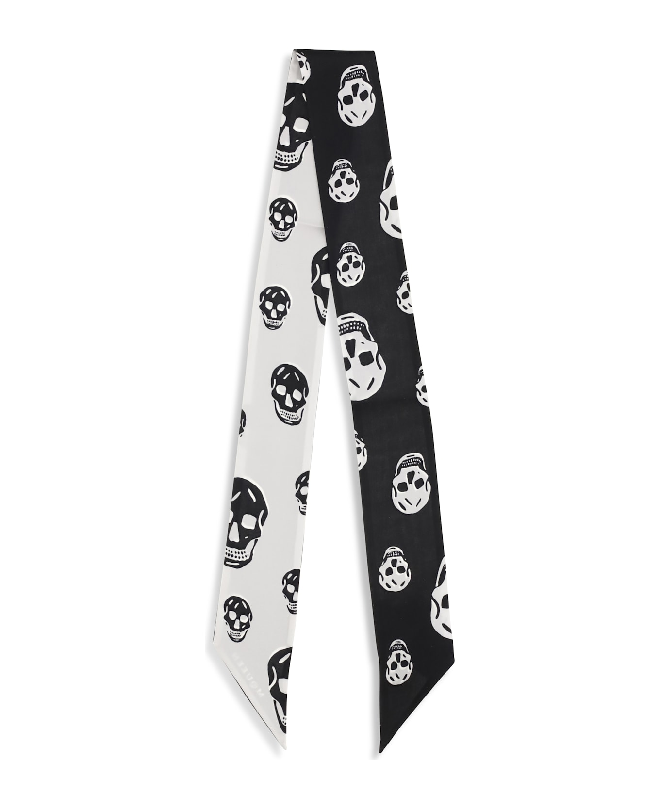 The skull ribbon scarf by alexander mcqueen is made of silk twill with an all-over black and ivory skull pattern. finished with the mcqueen logo on the bottom, it can be wrapped around the wrist or over bags from the collection, adding a distinctive and versatile touch to the look. Composition: 100% % Silk