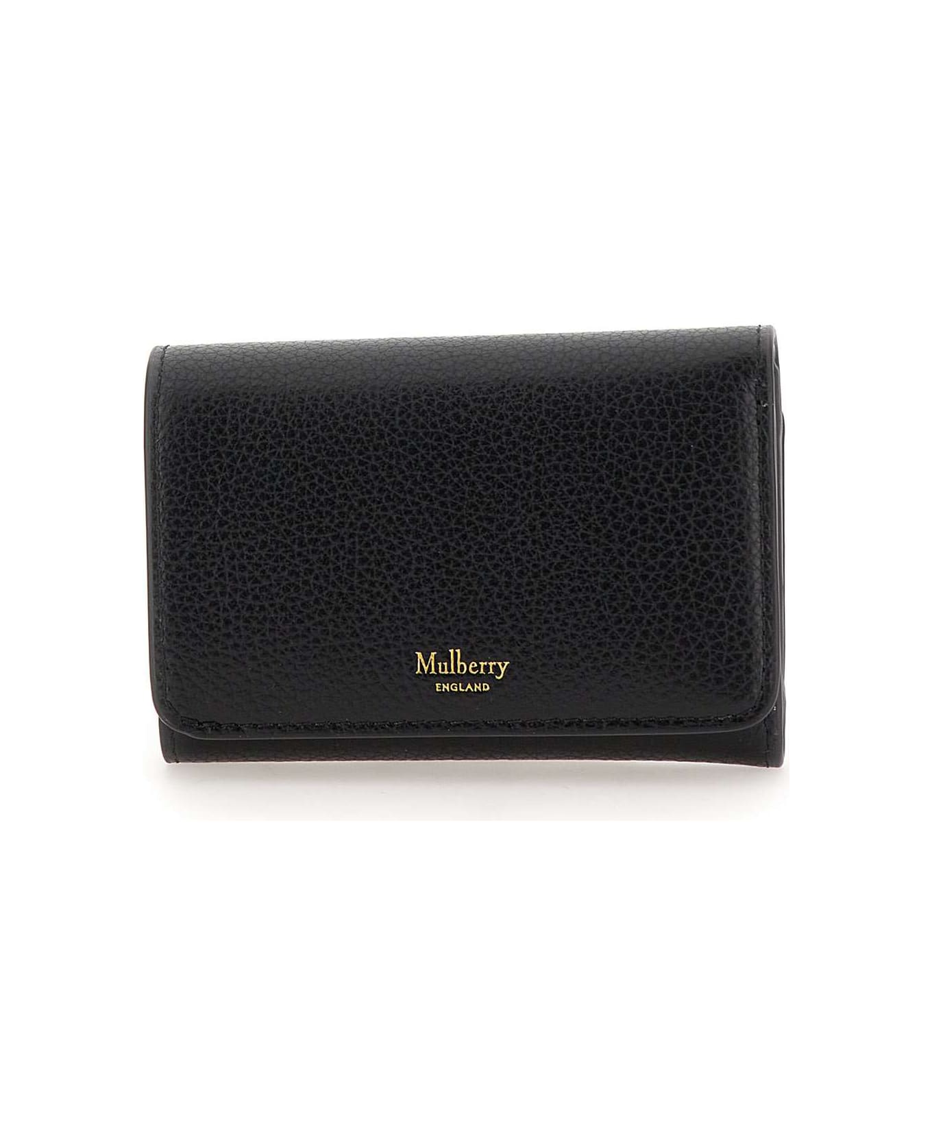 Mulberry women's leather wallet "Continental Trifold", black, button fastening, six internal credit card slots, two internal slip pockets, one compartment for banknotes, one external coin compartment with zip, gold iconic logo on front, logo print gold inside. Dimensions: height: 6. 6cm, width: 11cm.