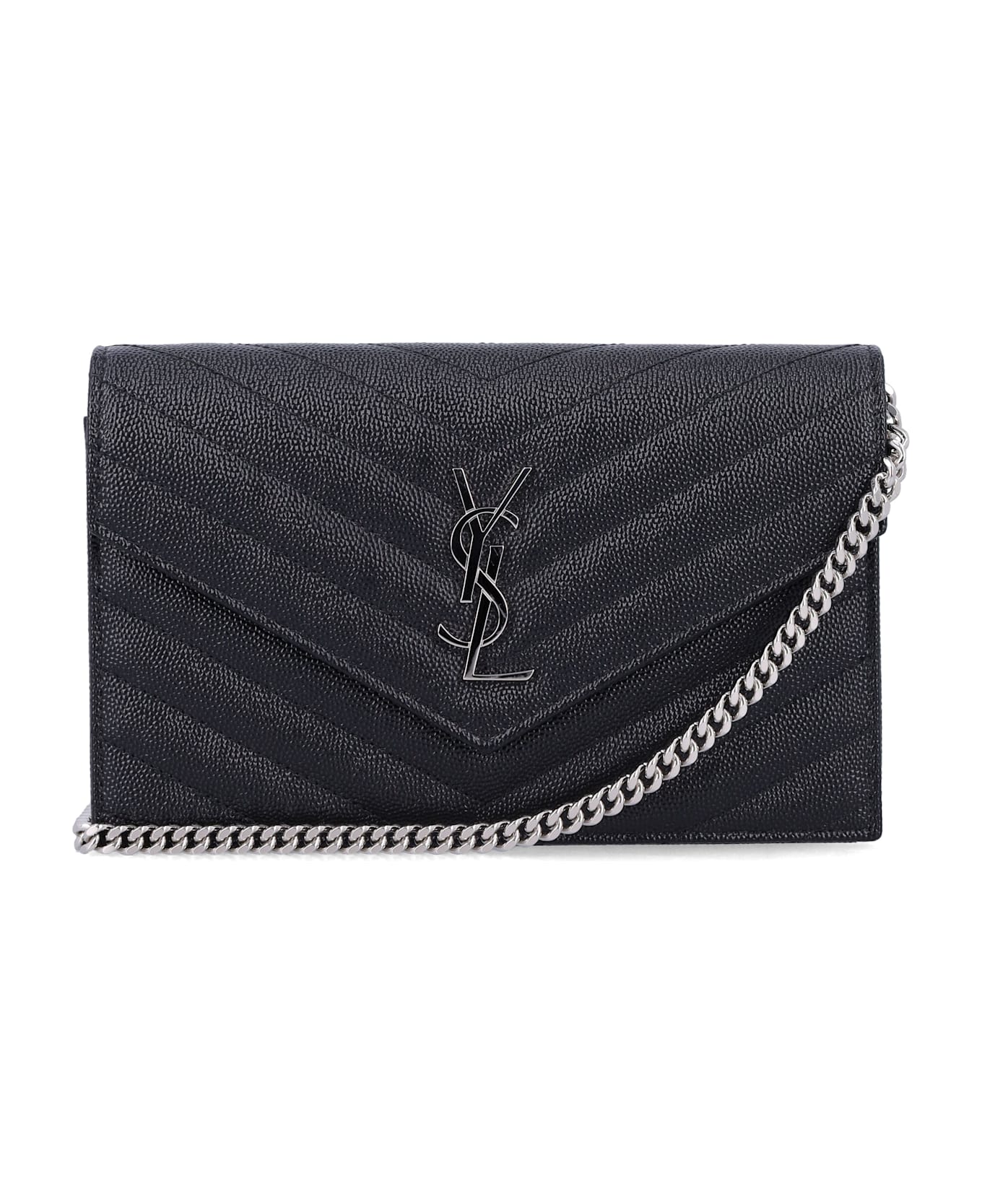 The Saint Laurent Cassandre Envelope Chain Wallet Epitomizes Refined Elegance. Crafted In Grain De Poudre Leather With Iconic Chevron Quilting, It Is Finished With The Signature Silver-toned Cassandre Logo. Compact Yet Practical, It Features A Zip Pocket And Card Slot, And Can Be Carried On The Shoulder Or Crossbody With Its Leather-reinforced Chain Strap. Silver-toned Cassandre Logo On The Flap Snap-button Closure Chain Strap With Leather Insert One Internal Zip Pocket One Internal Card Slot Grosgrain Lining Chrome- And Metal-free Tanned Leather Height: 12 Cm Width: 19 Cm Depth: 3,5 Cm