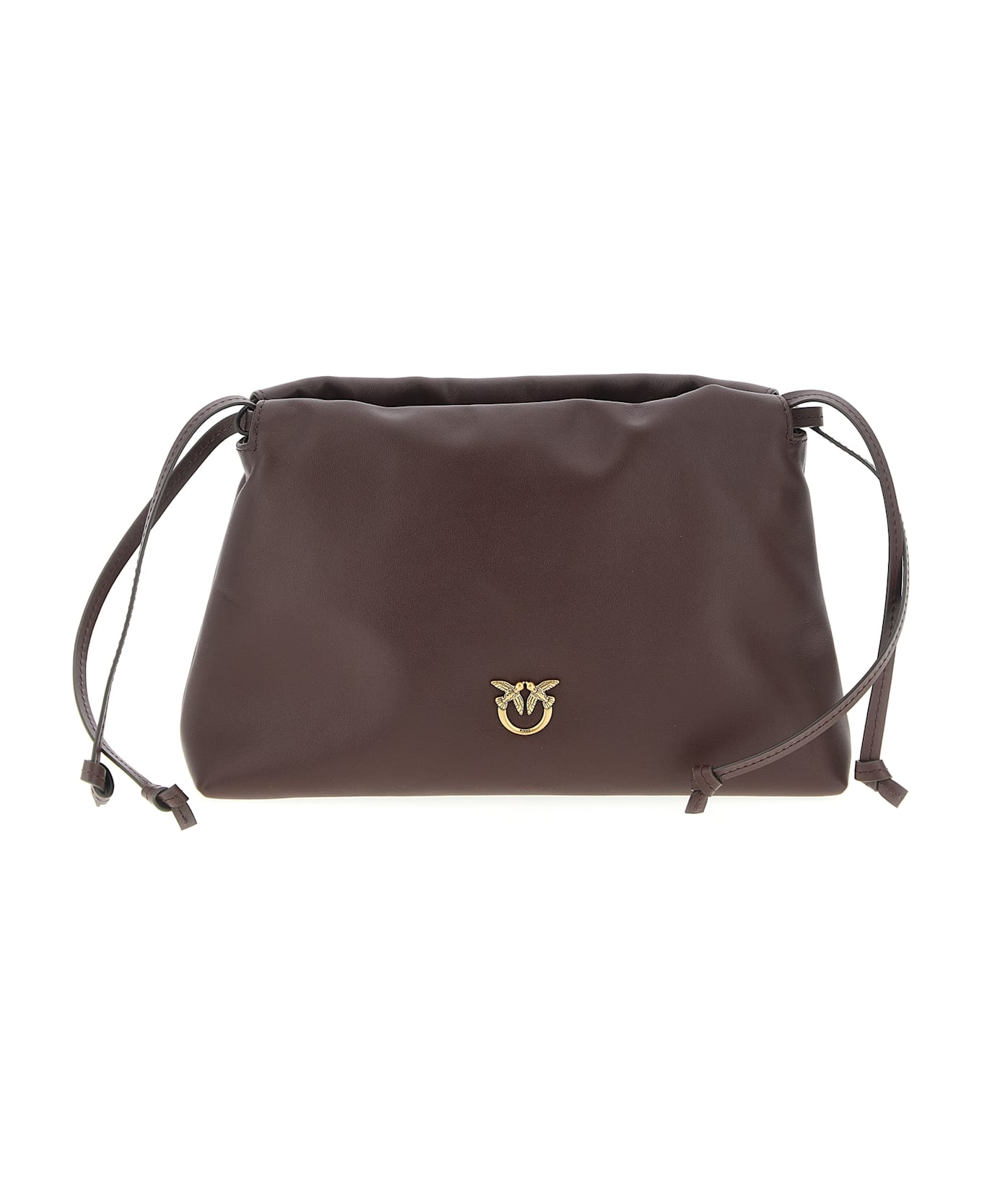 Smooth calf leather mini clutch with matte finish, bag silhouette, metal 'Love Birds' logo on the front and embroidered on the back, drawstring closure, adjustable shoulder strap, tech fabric lining.