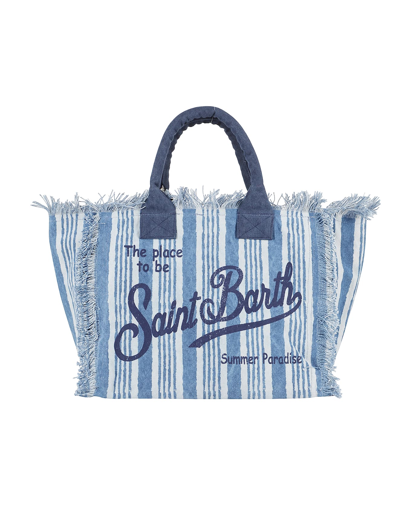 Vanity D bag - MC2 Saint Barth - Light blue and white color - Made of cotton canvas with striped pattern - Double handles - Inside zipper closure - Frayed profiles - Contrasting printed front logo - Size: 32 x 40 x 20 cm.