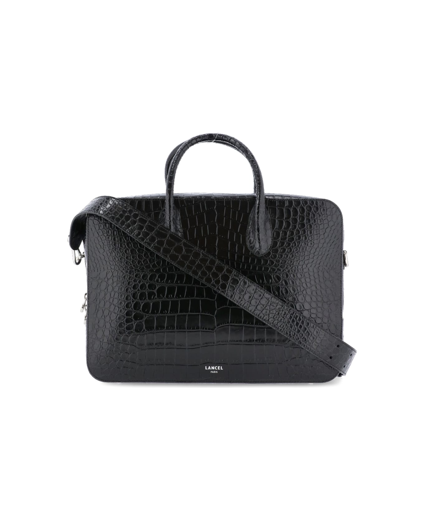 Alice Bag from Lancel: - Shiny crocodile-style cowhide leather bag - Double handles - Adjustable and removable shoulder strap - Textile lining - Four metal base feet - Golden logo at front - One interior zipped pocket - Two interior patch pockets - A padded compartment for a computer