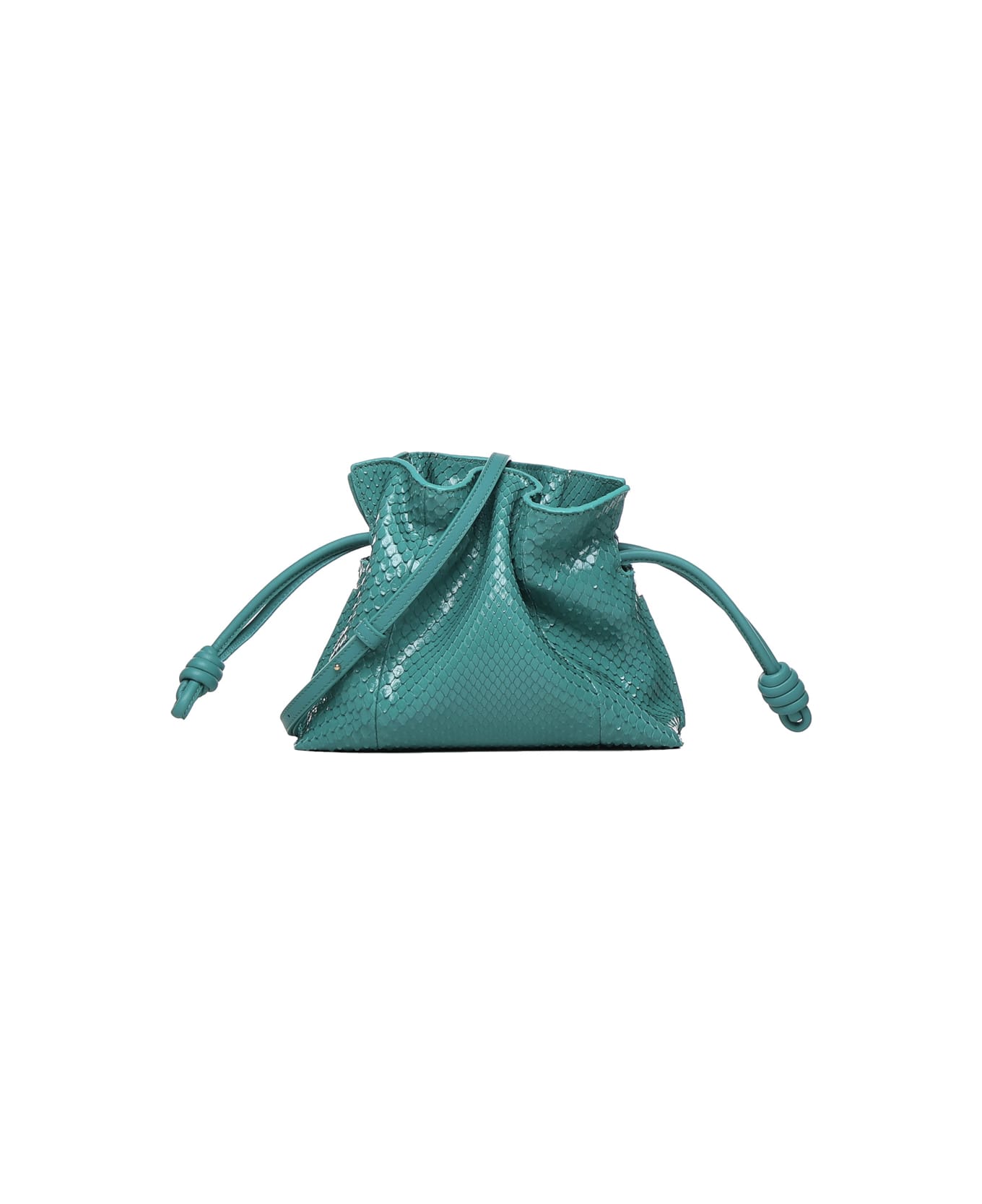 Emerald green Mini Flamenco Clutch from Loewe -Flamenco mini leather clutch -Magnetic closure -Top closure with drawstring with knotted edges -Adjustable and removable shoulder strap -Suede lining -Anagram embossed on the front -Measurements: 26x14x7 cm -Made in Spain -Colour: Green -100% Calfskin
