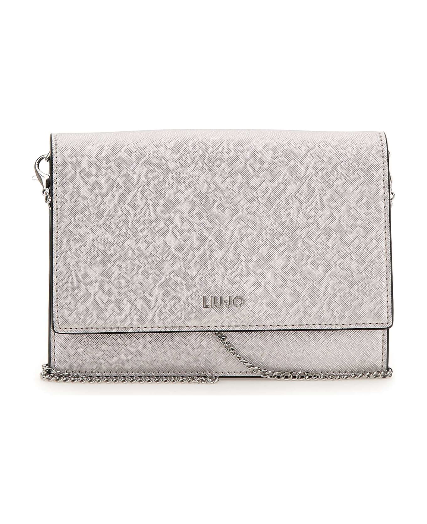 Liu-Jo "Caliwen" shoulder bag, silver color, eco-sustainable in Pu,silver metalwork,front metal logo, three compartments, one of which is central with zip, eight internal card slots, button fastening. Measures:length 22cm, depth 3cm, height 15cm.