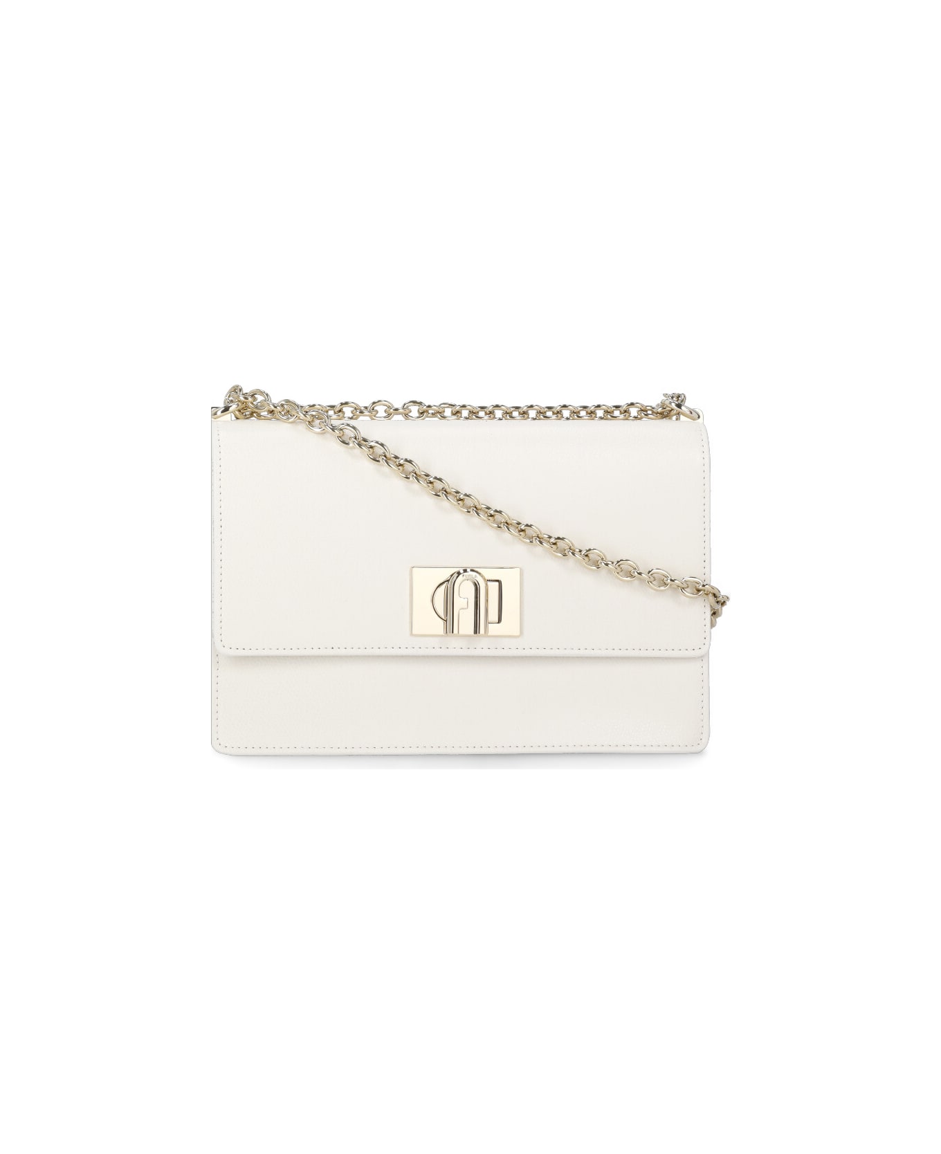 - Ivory Furla pebbled leather shoulder bag for woman - Front flap with metal slot fastening - One rear slit pocket - Adjustable leather shoulder strap with metal chain - One interior compartment - One interior welt pocket - One interior zip pocket