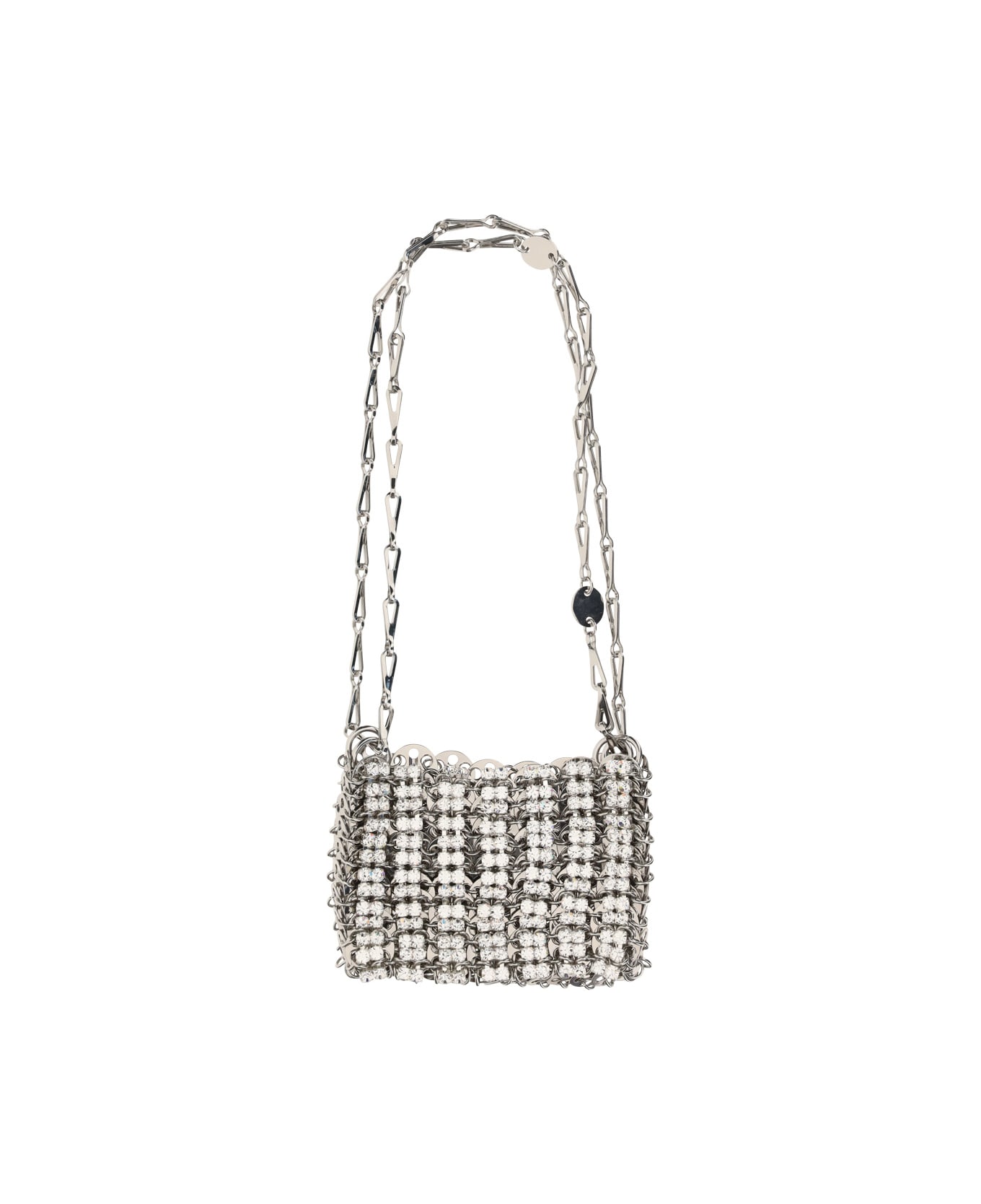 1969 nano pouch by paco rabanne, design with iconic metallic discs assembled together, chainmail effect, single internal compartment, sliding chain strap. Composition: 100% % Plastic