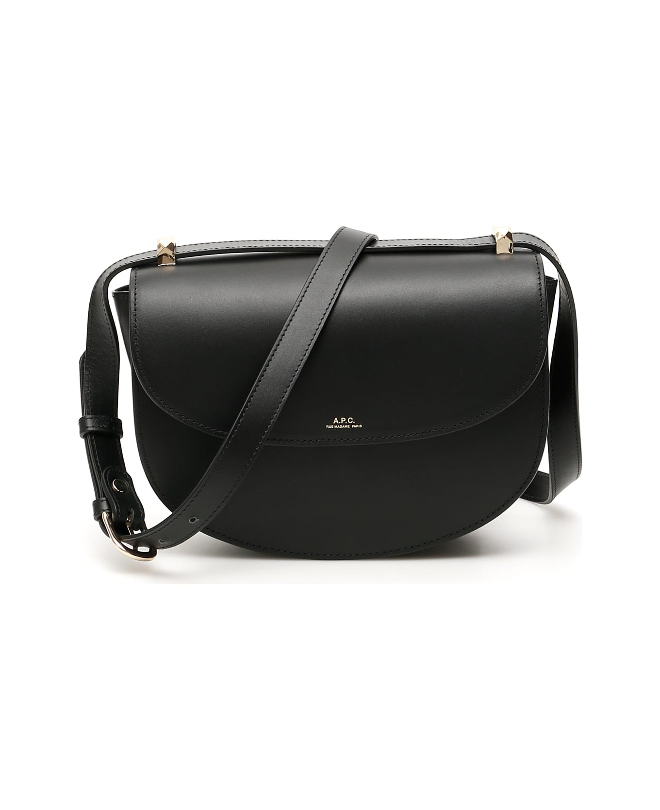 A. P. C. leather Genève bag with removable and adjustable sliding strap that can be used as a double handle. Flap with magnetic button, gold-tone logo print on front, fabric lining with an open flat pocket. Gold-tone metal hardware.