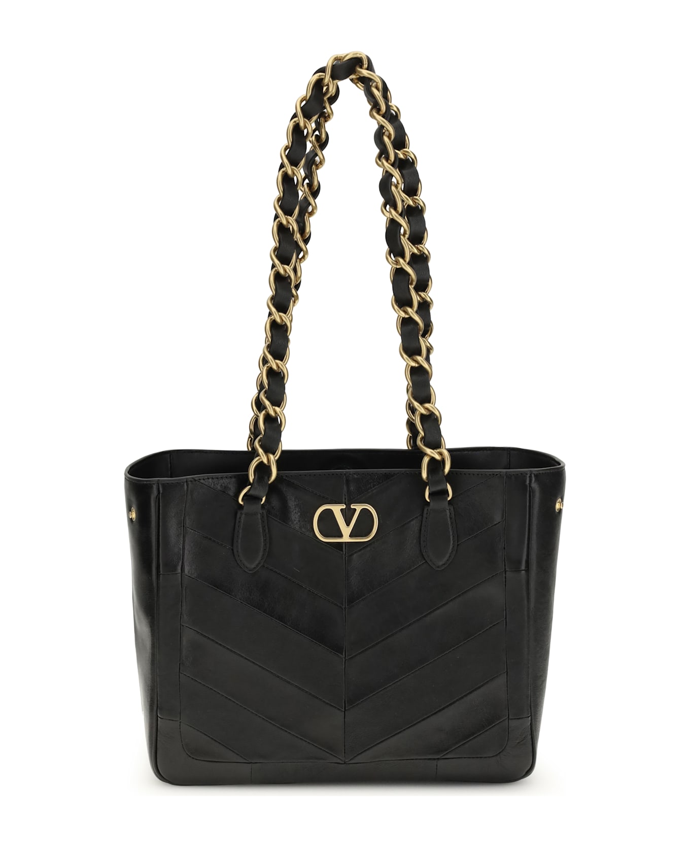 The laseine small shopping bag by valentino garavani is crafted from soft nappa leather featuring a refined chevron pattern created through a patchwork of matte and shiny finishes. the design includes chain handles interwoven with leather, allowing it to be comfortably carried on the shoulder. antique gold finish hardware enriches the silhouette, highlighted by the iconic vlogo signature metal detail. a magnetic closure ensures practicality and security, while the nappa-lined interior offers optimal organisation with both a slip pocket and a zip pocket. an elegant and sophisticated piece designed to elevate any occasion with timeless style.