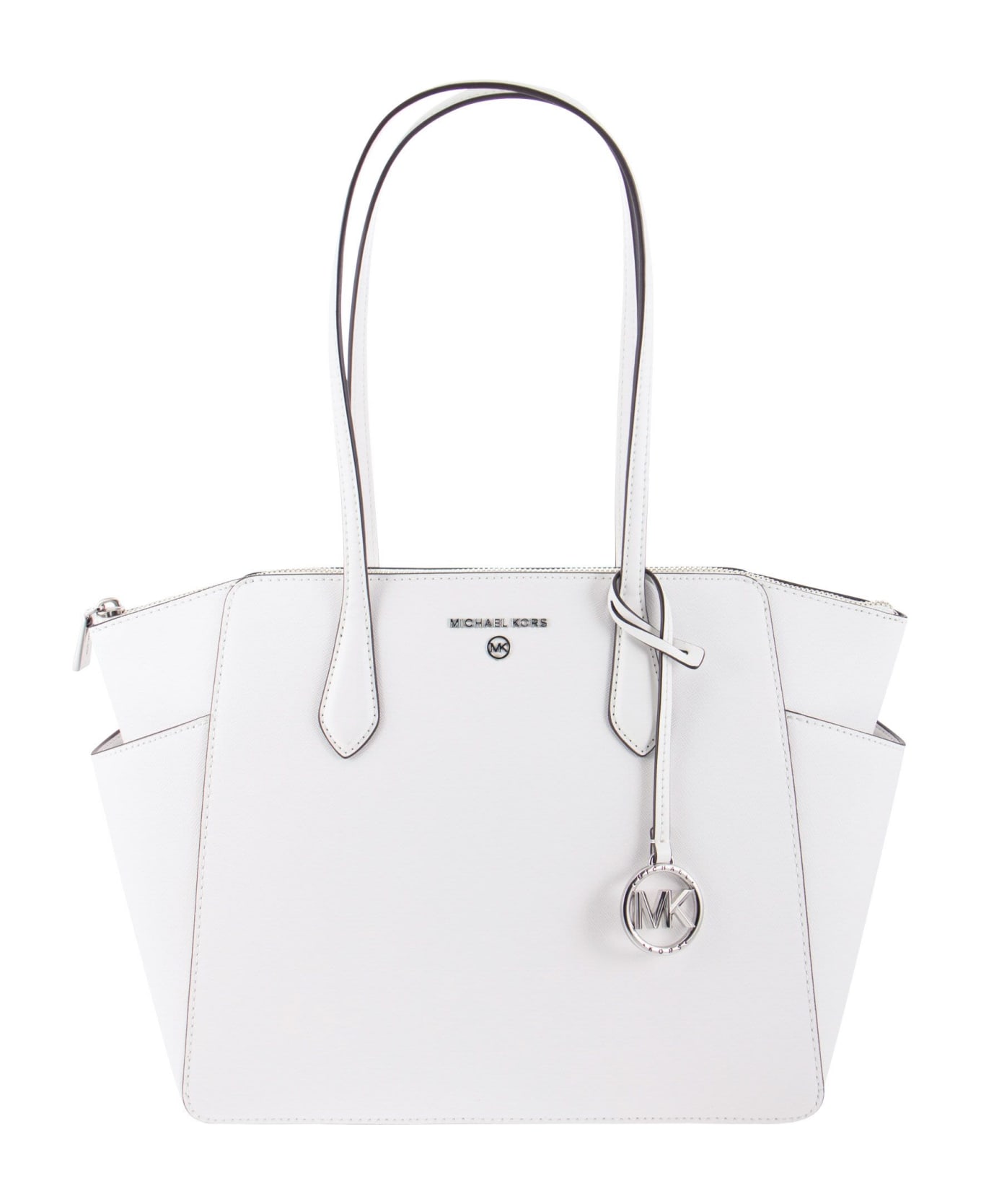The Marilyn tote bag is an essential everyday accessory. The iconic "MK" initials lend an unmistakable charm to this Saffiano leather model with a structured design, while the capacious interior features pockets for everyday items. Slim handles make it ideal for comfortable shoulder wear on busy days. - Gold-tone metal details - External details: 2 side pouch pockets - Interior details: back zip pocket, 2 front slip pockets - Zip closure DESIGNER ID: 30S2S6AT2L 085