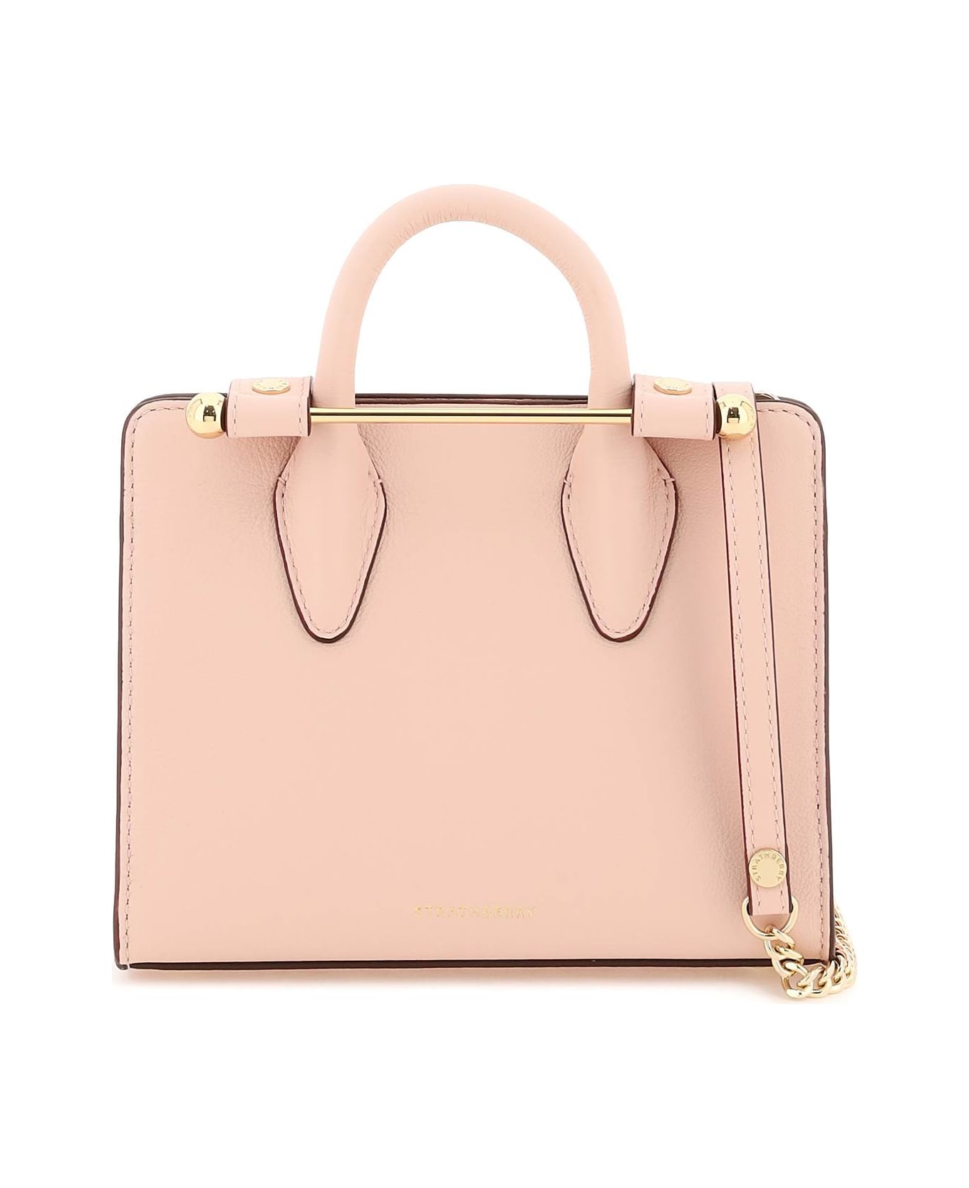 Nano Tote bag by Strathberry in smooth calf leather, featuring the iconic metal bar which closes the bag stopping the single top handle. Gold-tone lettering logo print on front, magnetic closure, gusseted sides, suedette lining and one inner open flat pocket. Equipped qith detachable chain strap with leather insert. Gold-finished metalware and protective studs.