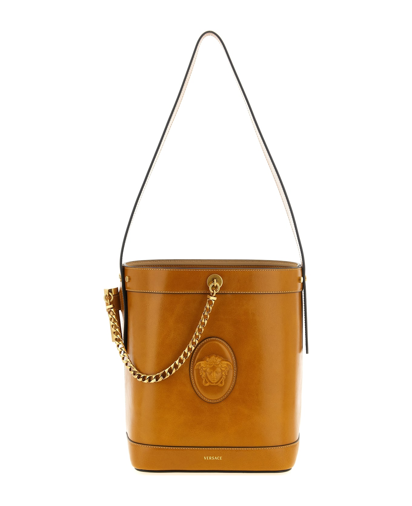 Small 'Pivot' bucket bag in natural leather, 3D 'Medusa Cameo' detail and antiqued metal chain on the front, double fixed handles that can be stored inside the bag, internal magnetic closure, rigid base, shoulder strap.