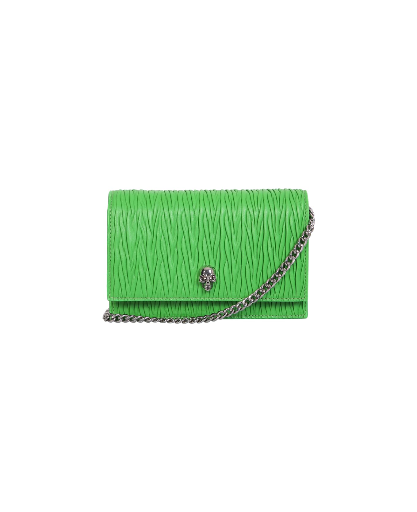 Fully pleated. Skull charm. Main compartment. Internal slip pocket. Magnetic fastening. Chain-link shoulder strap. Color: green