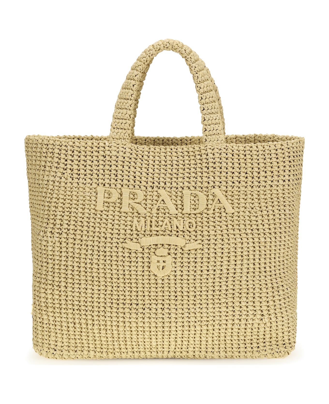 The raffia tote bag by prada is a lightweight and elegant accessory, perfect for the summer season. crafted from raffia, it features an embroidered logo on the front and the iconic metal triangle with the logo on the side. the two flat raffia handles ensure comfortable carrying, while the unlined structure enhances its natural, effortless look, ideal for a casual-chic style.