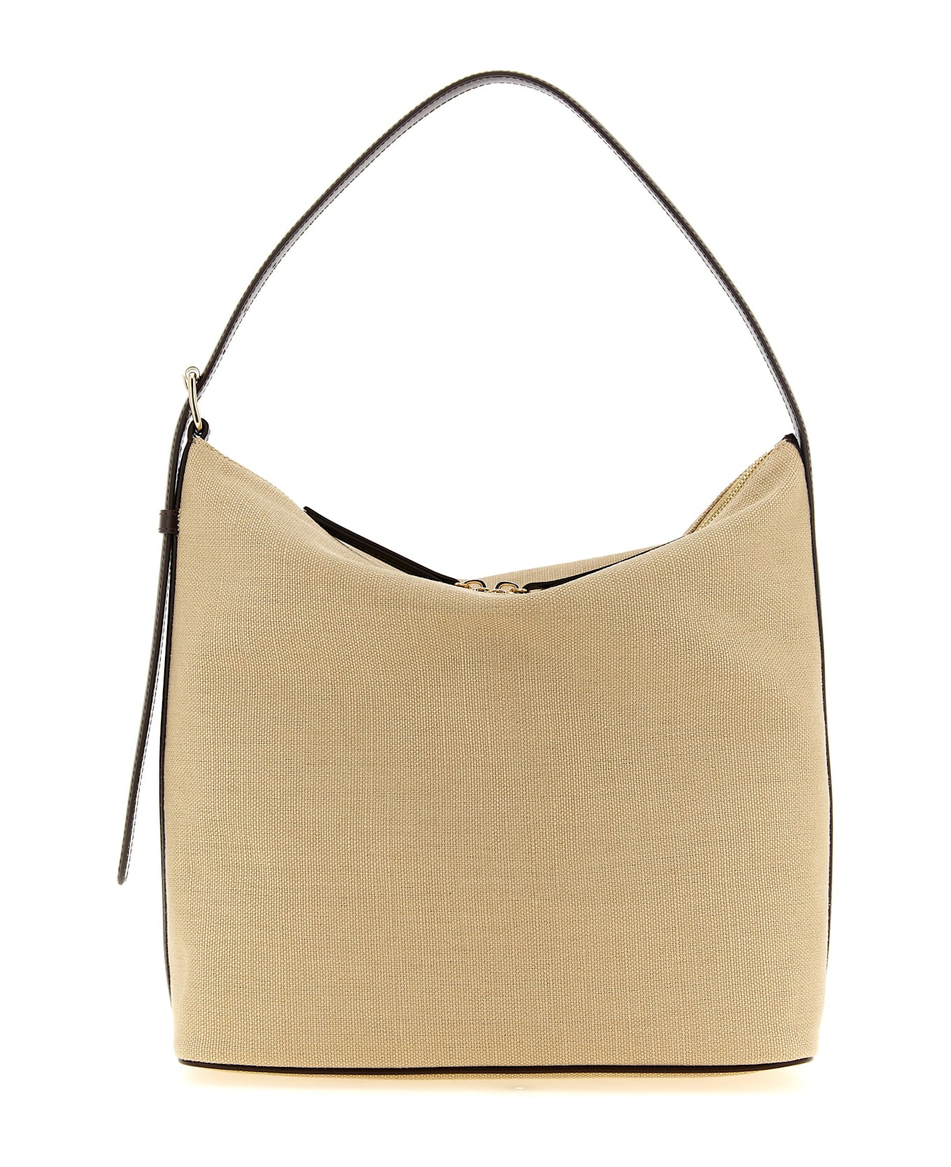'Vera' cotton canvas shoulder bag with contrasting smooth leather details, adjustable handle, top zip closure, rigid base.