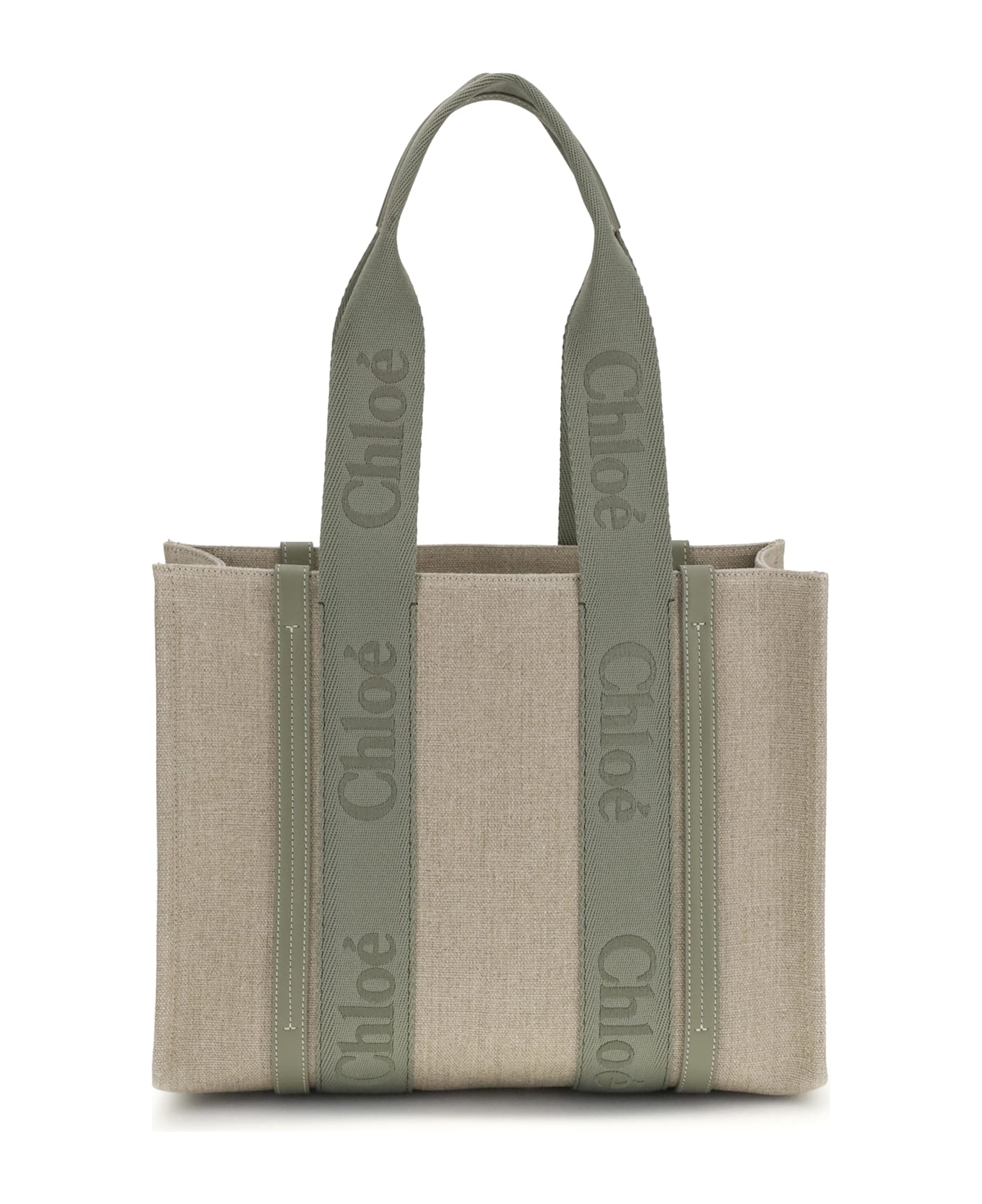 The woody shoulder bag by chloé is crafted from elegant linen with a refined design and distinctive details. double flat handles are enhanced by contrasting leather extensions on the side panels, while the brand's iconic monogram adds a touch of class. inside, a welt pocket offers practicality, while the interior hidden magnetic button closure provides security without compromising style.