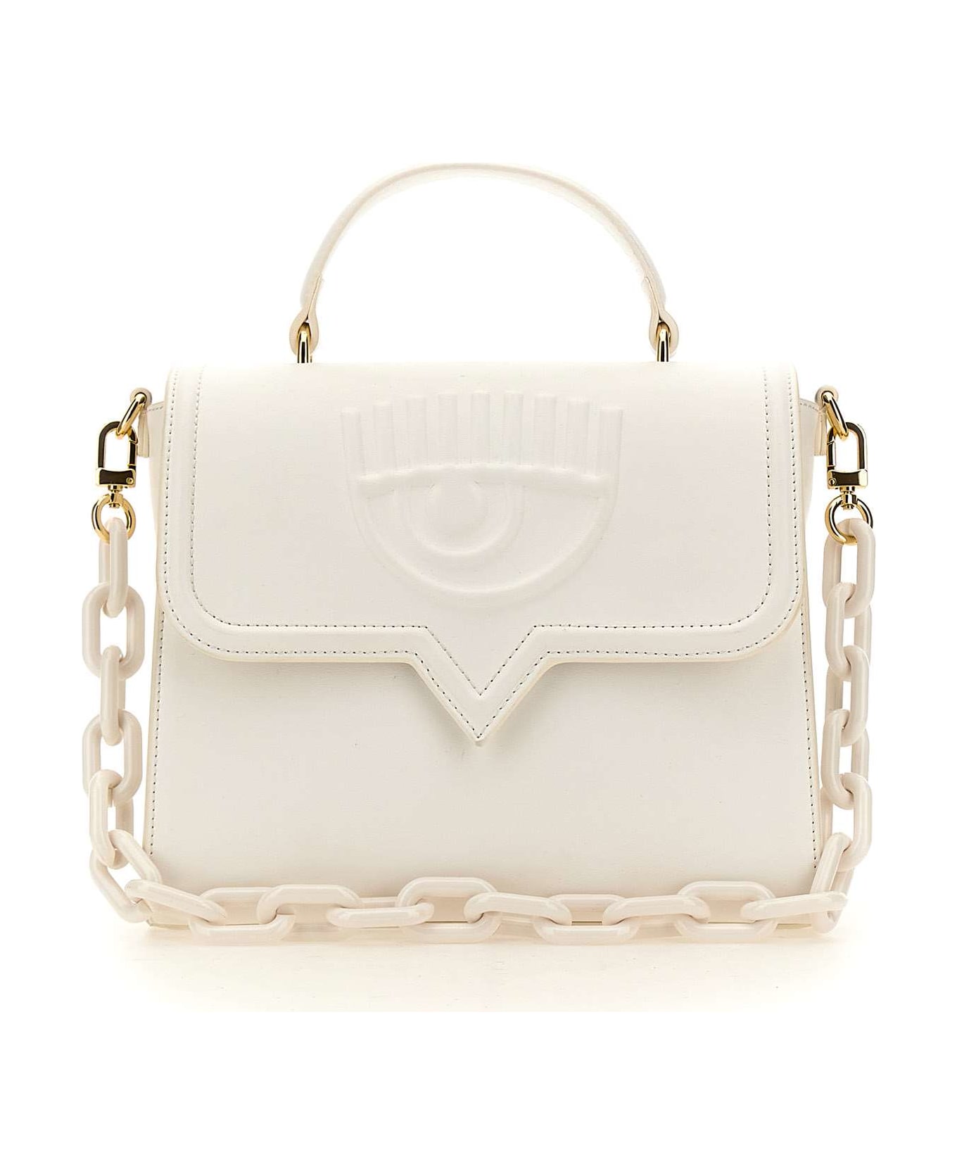Chiara Ferragni "Eye Like" smooth handbag, white eco-leather, top handle, fastening with flap and button, maxi Eye Like logo in front, internal pockets, one of which with zip, shiny gold hardware, double shoulder strap in eco-leather and chain. Dimensions: length 24cm, height 19cm, depth 12cm.