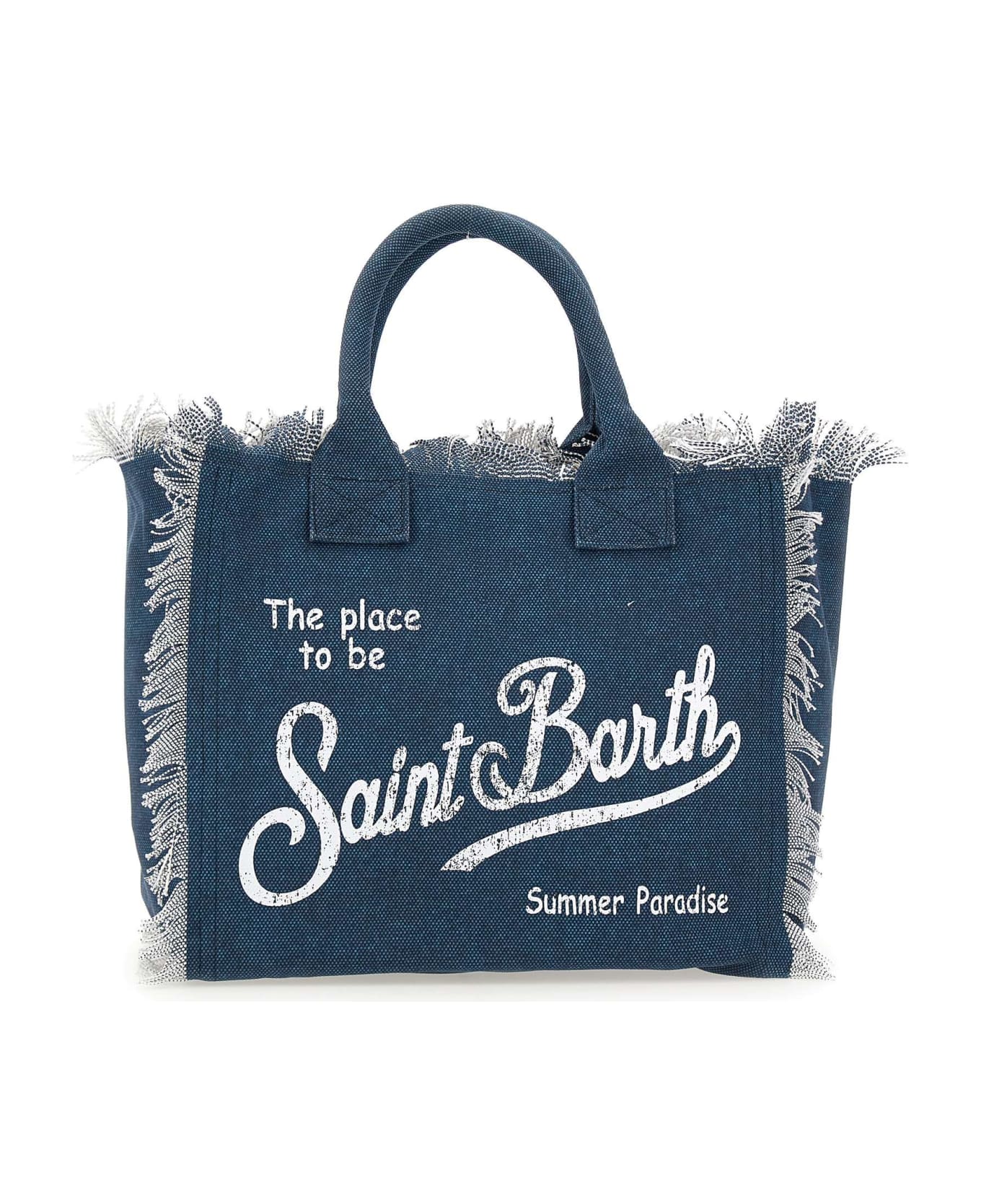 Mc2 Saint Barth "Vanity Summer Paradise" cotton canvas handbag, denim color, double top handle, fringe detail, top zip closure, single internal compartment, internal zip pocket, slip pocket with logo, cotton lining, maxi white logo print on front and back. Dimensions: length 40cm, depth 20cm, height 32cm.