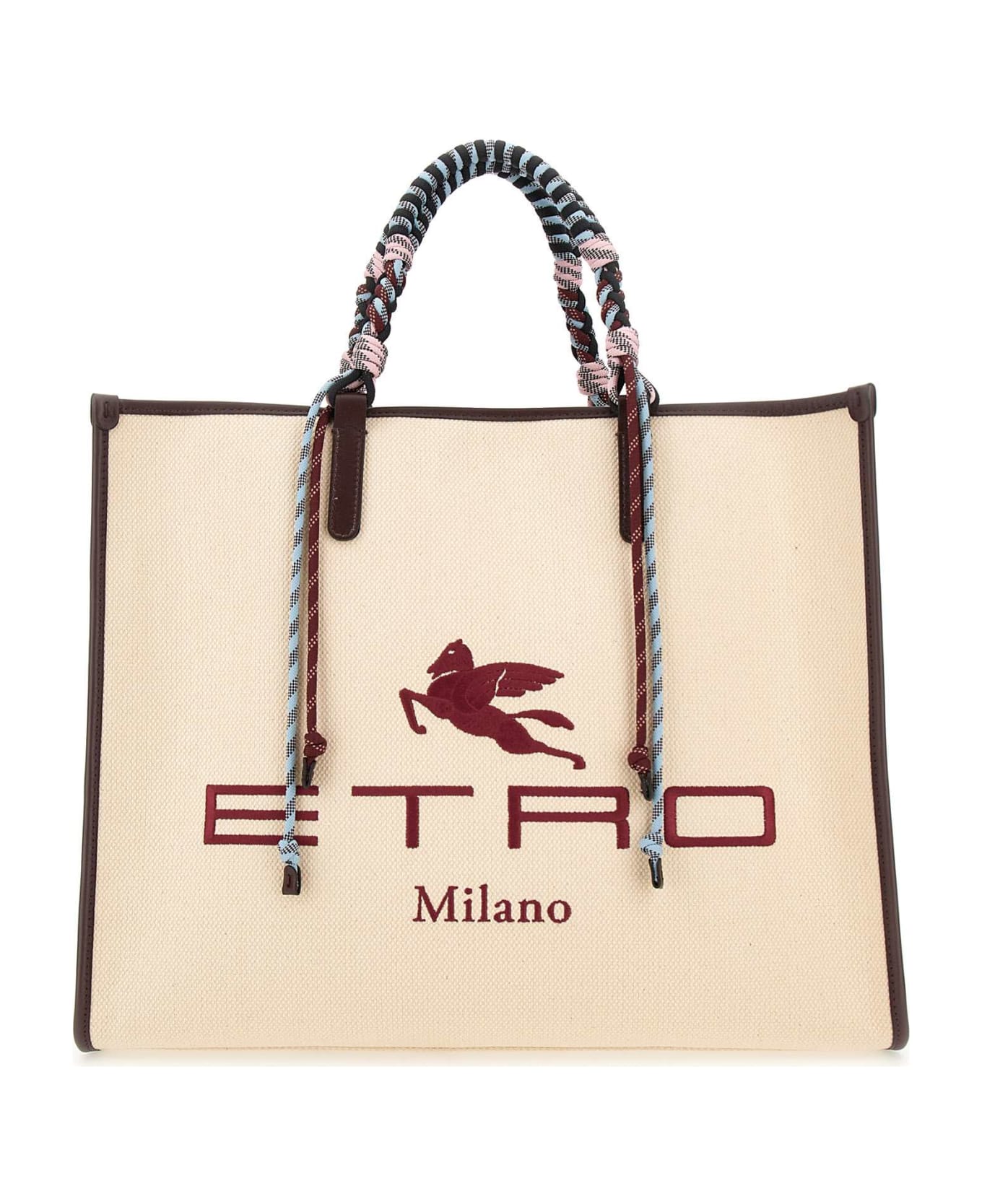 Etro handbag, cream with dark burgundy profiles, in cotton fabric with leather details, multicolor braided handles, maxi logo with contrasting embroidered Pegasus on front, internal zip pocket, metallic accessories with light gold finish. Made in Italy. Dimensions: length 41cm, height 35cm, depth 17cm.