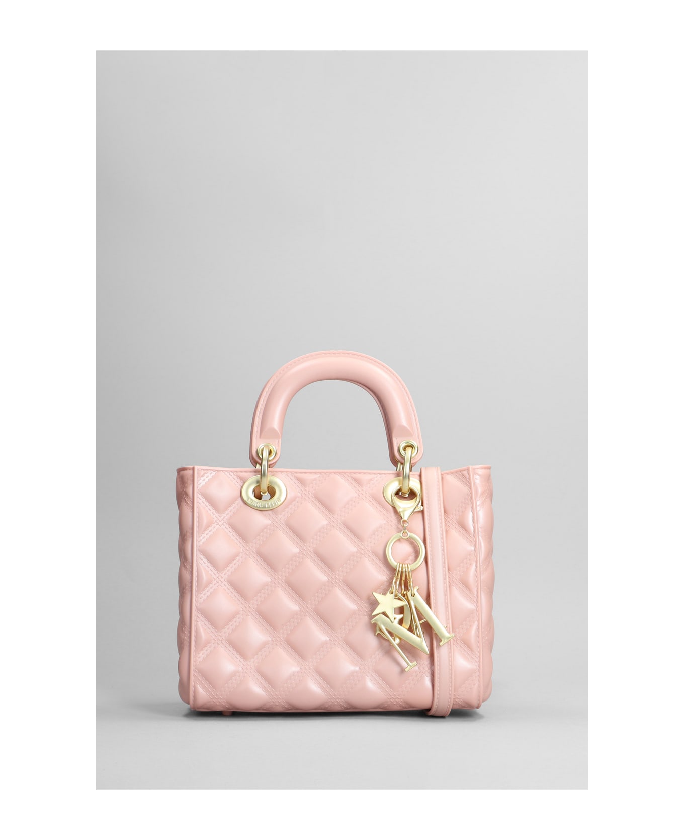 Flat Missy M Hand bag in rose-pink rubber/plasic, double handle, shoulder strap, logo metal charm, quilted design, Made in Italy, 100% rubber , Height 185 mm, Width 205 mm