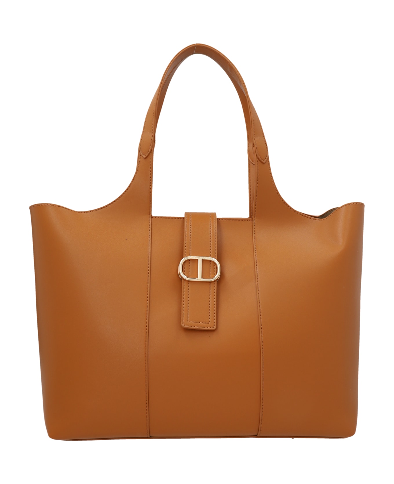 Faux leather shopping bag with zip and hook closure, metal logo, double handle.