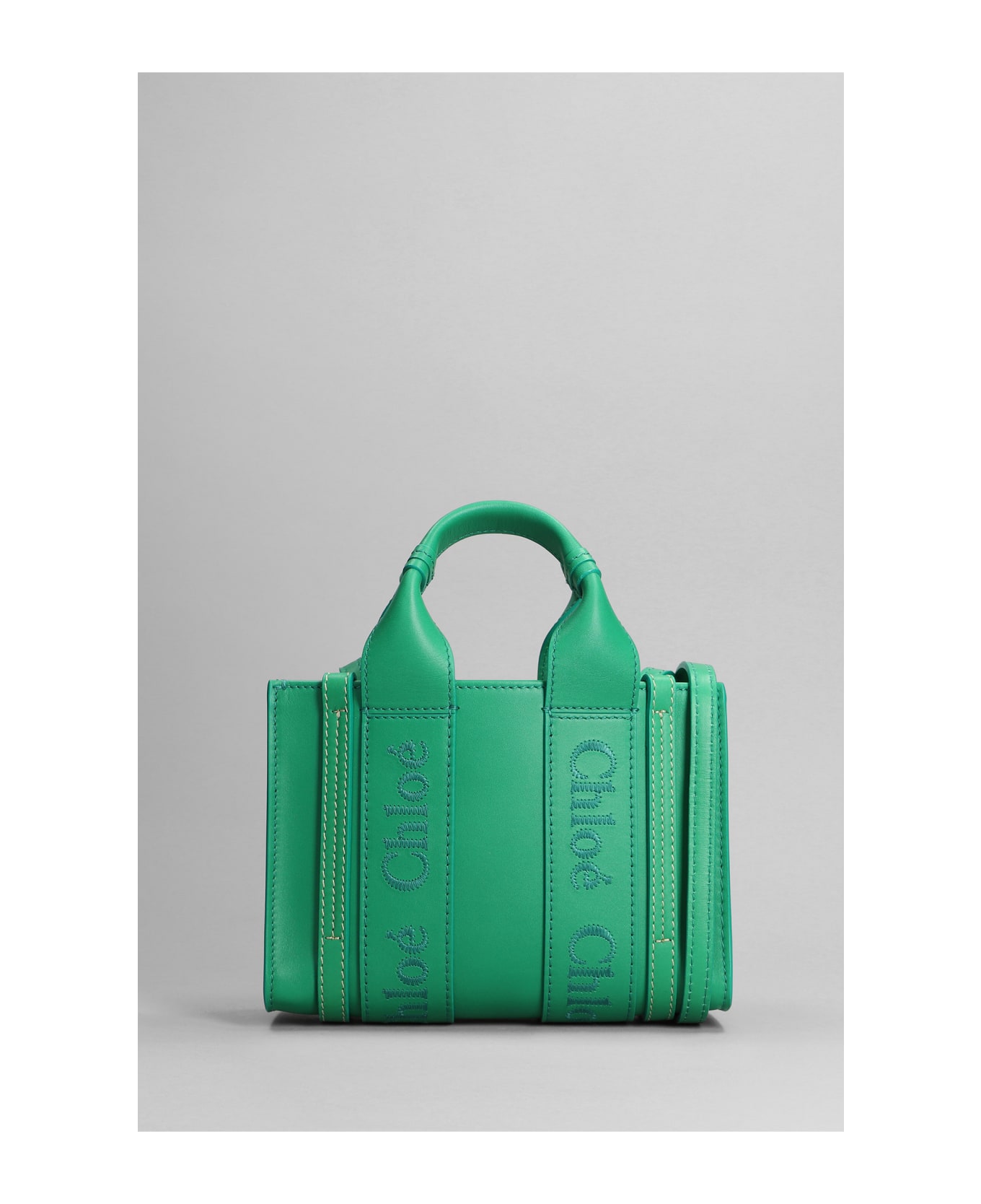 Woody Hand bag in green leather, double handle, detachable shoulder strap, embroidery logo, 100% leather, Made in Italy, Height 145 mm, Width 200 mm