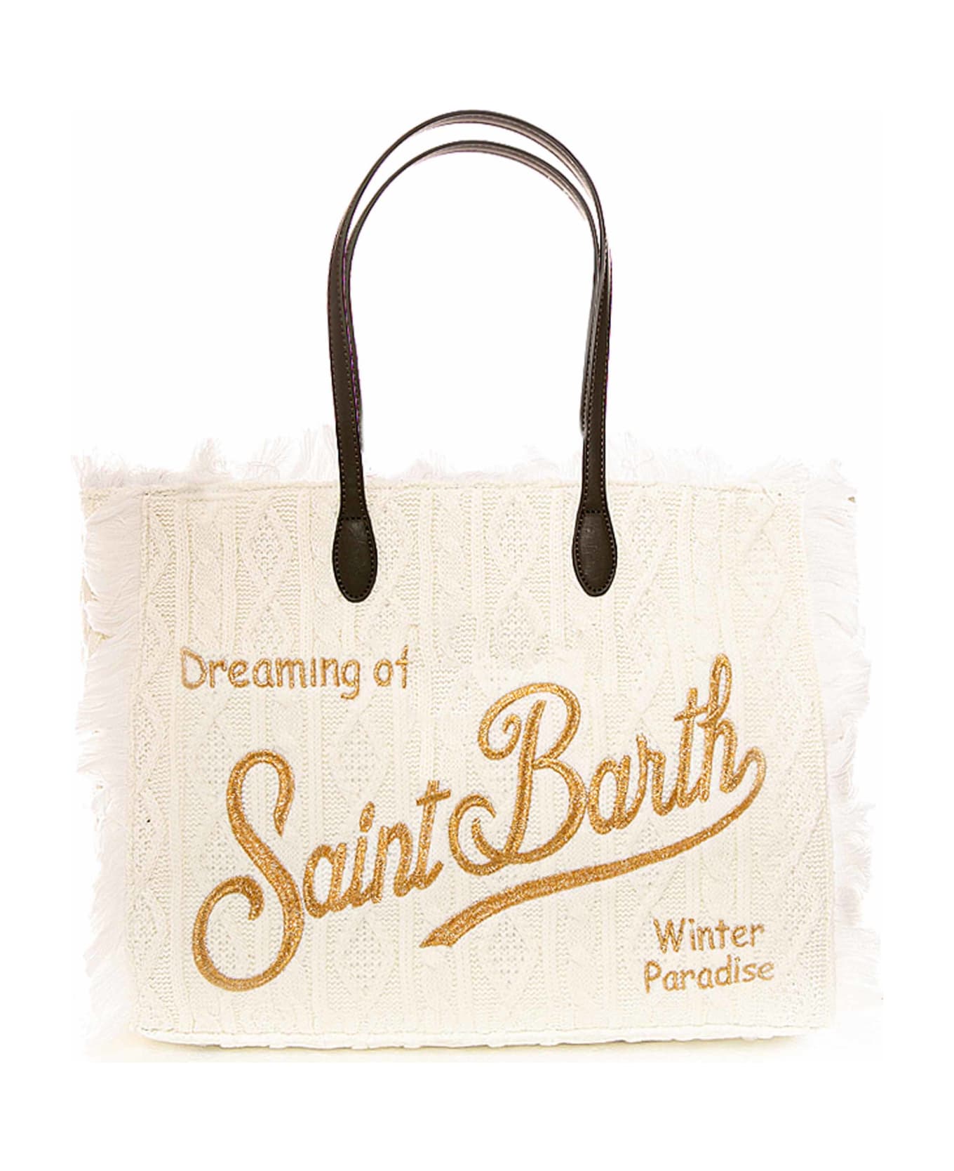 Vanity wooly white tricot shoulder bag Front Saint Barth golden embroidery Eco leather handles Inside pocket with zip Sizes: L 40 cm x W 30 cm x H 14 cm.