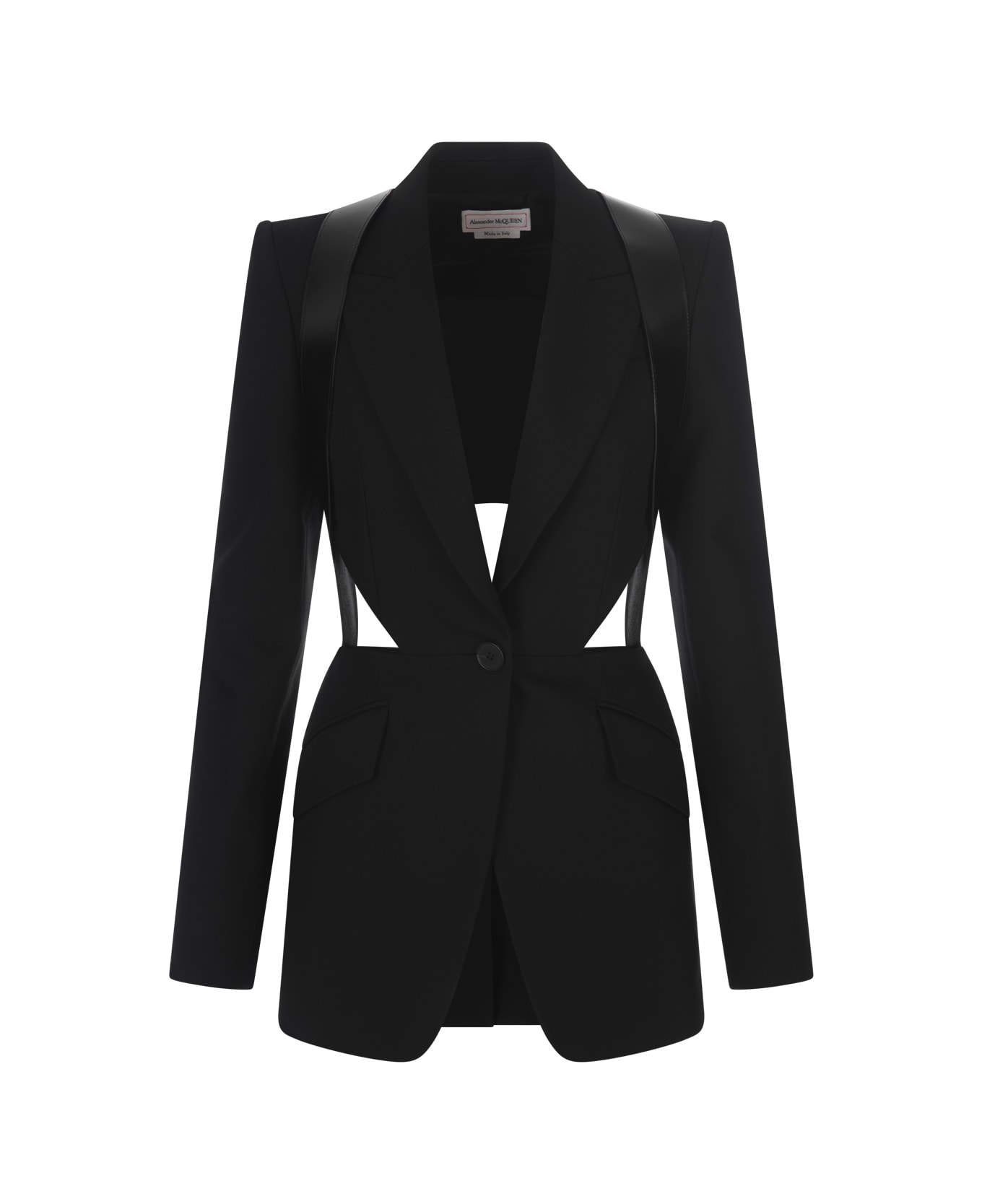 This single-button jacket from Alexander McQueen has been crafted from black tailored wool with leather harnesses and cut-outs. The garment features peaked lapels, two side flap pockets and a single button closure. Composition: 100% Wool