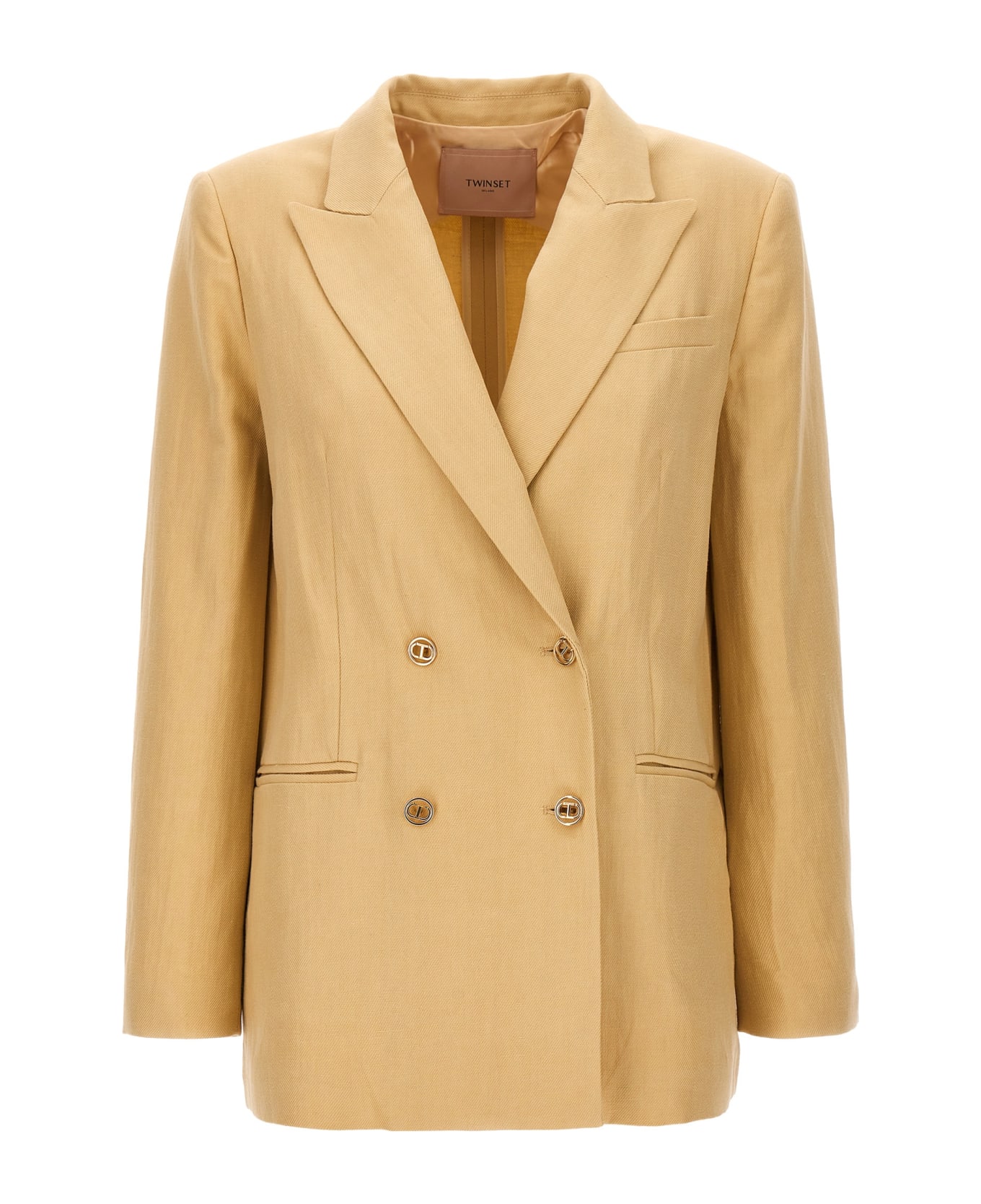 Double-breasted blazer in cotton blend linen with button closure, peak lapels, unlined.