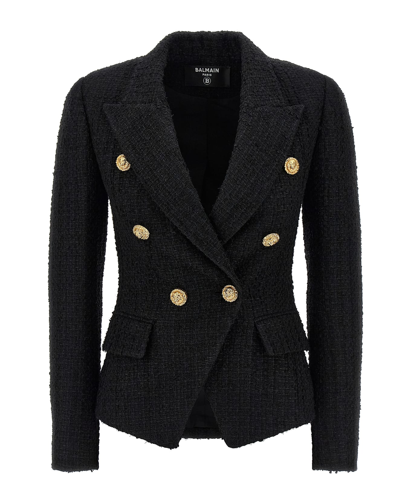 Double-breasted tweed blazer with front metal 'Testa di Leone' button closure, peak lapels, flap pockets, padded shoulders, long sleeves, asymmetric hem, viscose and cotton blend lining. Composition: 77% polyester 9% acetate 8% polyamide 6% wo