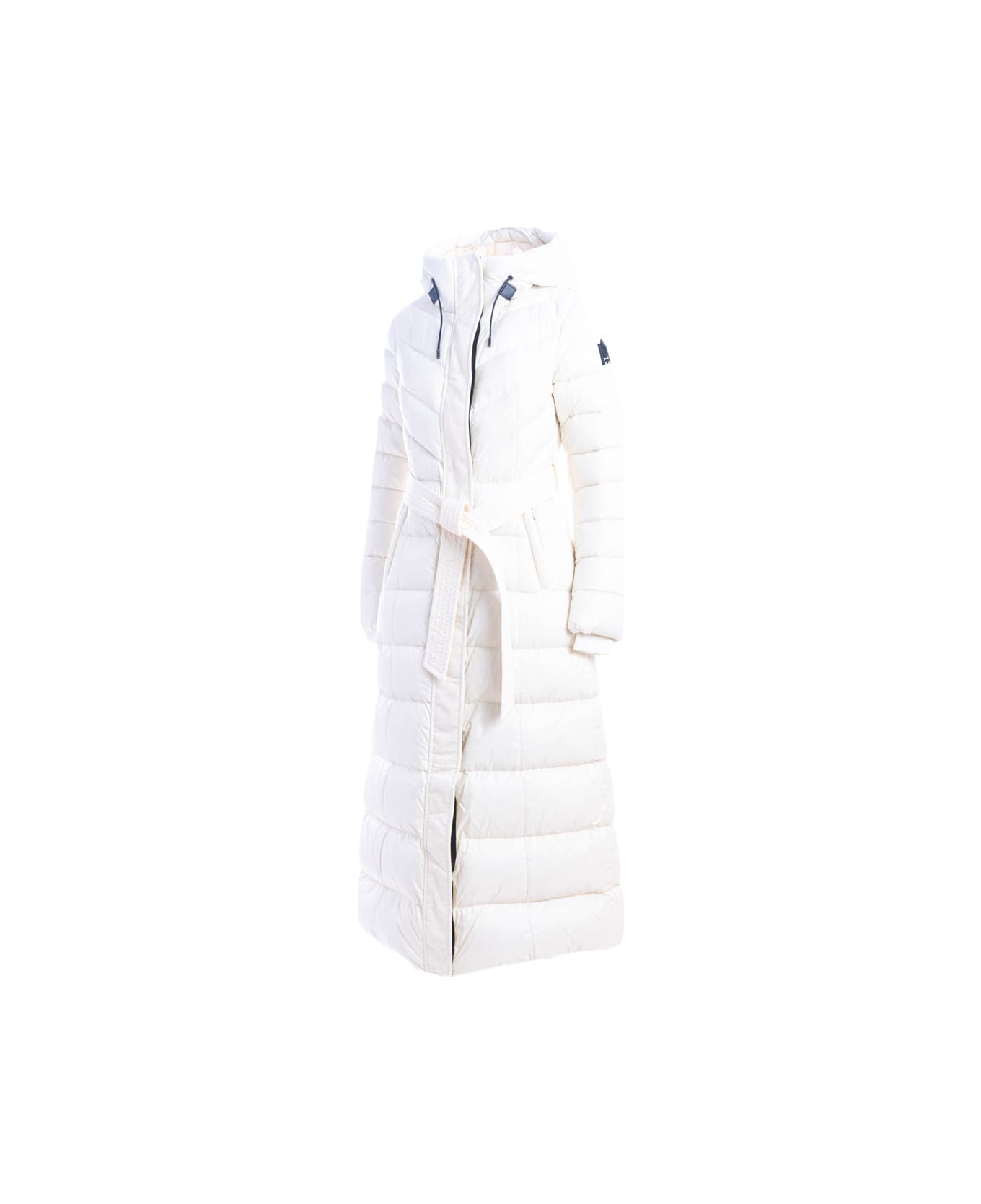 Woman maxi down jacket MACKAGE "CALINA", cream color, fitted line, water repellent, breathable, sash belt on waist, internal pillow collar, windproof cuffs adjustable visor with drawstring, trapeze silhouette, non-removable hood, zip and buttons fastening, pockets welt with zip, logo patch on sleeve and hood, inside pocket.