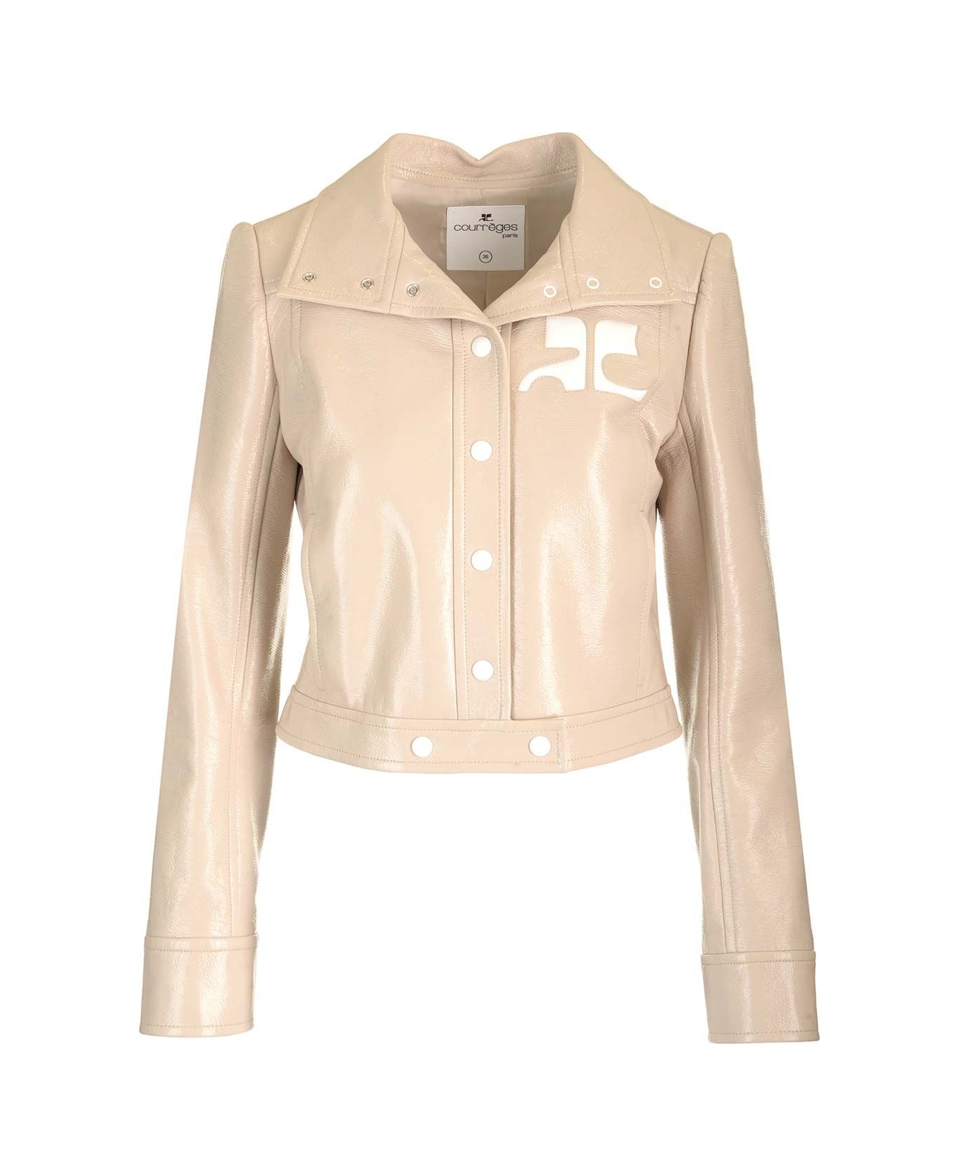 Beige vinyl jacket by Courreges with stand-up collar, lined interior, two side pockets and inlaid white AC logo on chest. Tight fit.