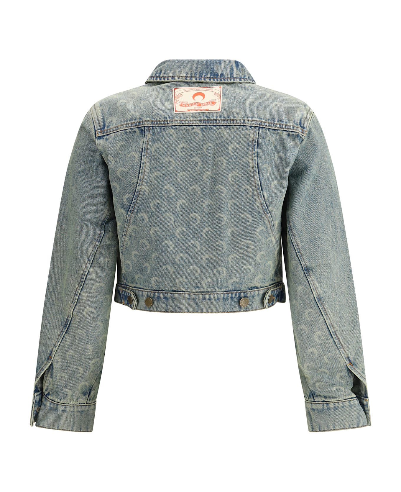 The marine serre moon denim jacket features a classic collar and a front button closure, maintaining a clean and sophisticated design. the cropped model offers a modern and versatile fit, while the two side welt pockets and the two patch pockets on the front add practicality and style. the brand's iconic moon pattern decorates the entire garment, giving it a distinctive and recognizable touch. the leather patch with the brand's logo on the back completes the design, making this jacket a unique and trendy piece. Composition: 100% % Cotton