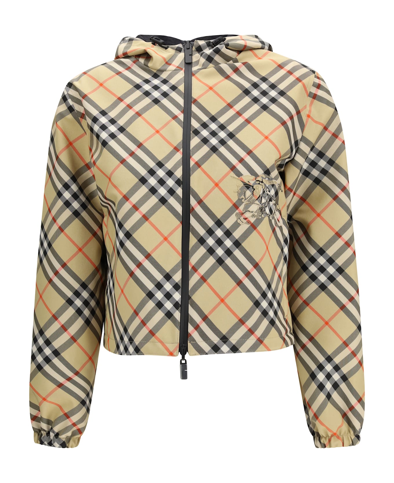 The reversible cropped check jacket by burberry combines functionality with iconic style. it features a two-way zip closure, drawstring hood and hem, and elasticated cuffs for a comfortable fit. the reversible design includes side zip pockets on one side and welt pockets with snap buttons on the other. the piece is finished with the equestrian knight design patch on the front, a signature detail of the house. Composition: 100% % Polyester